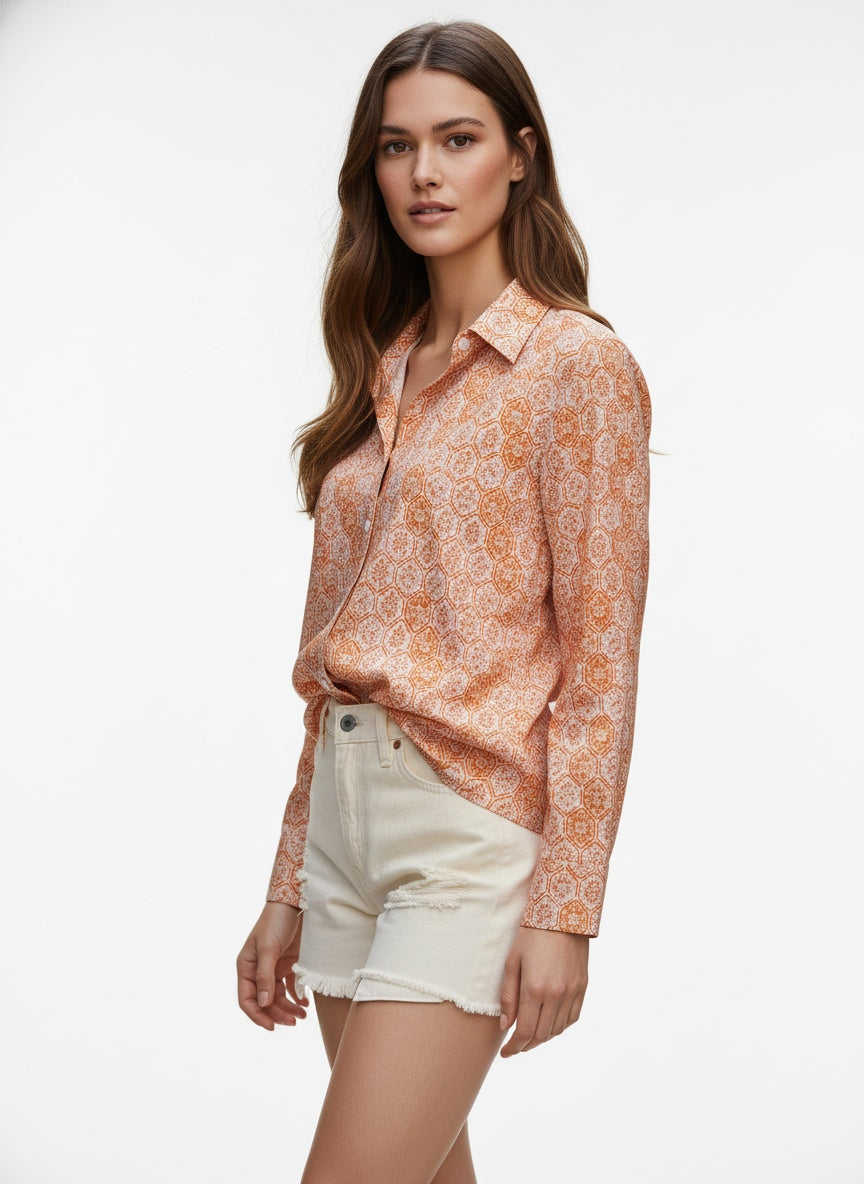 Orange Geometric Printed Poly Crepe Women's Shirt