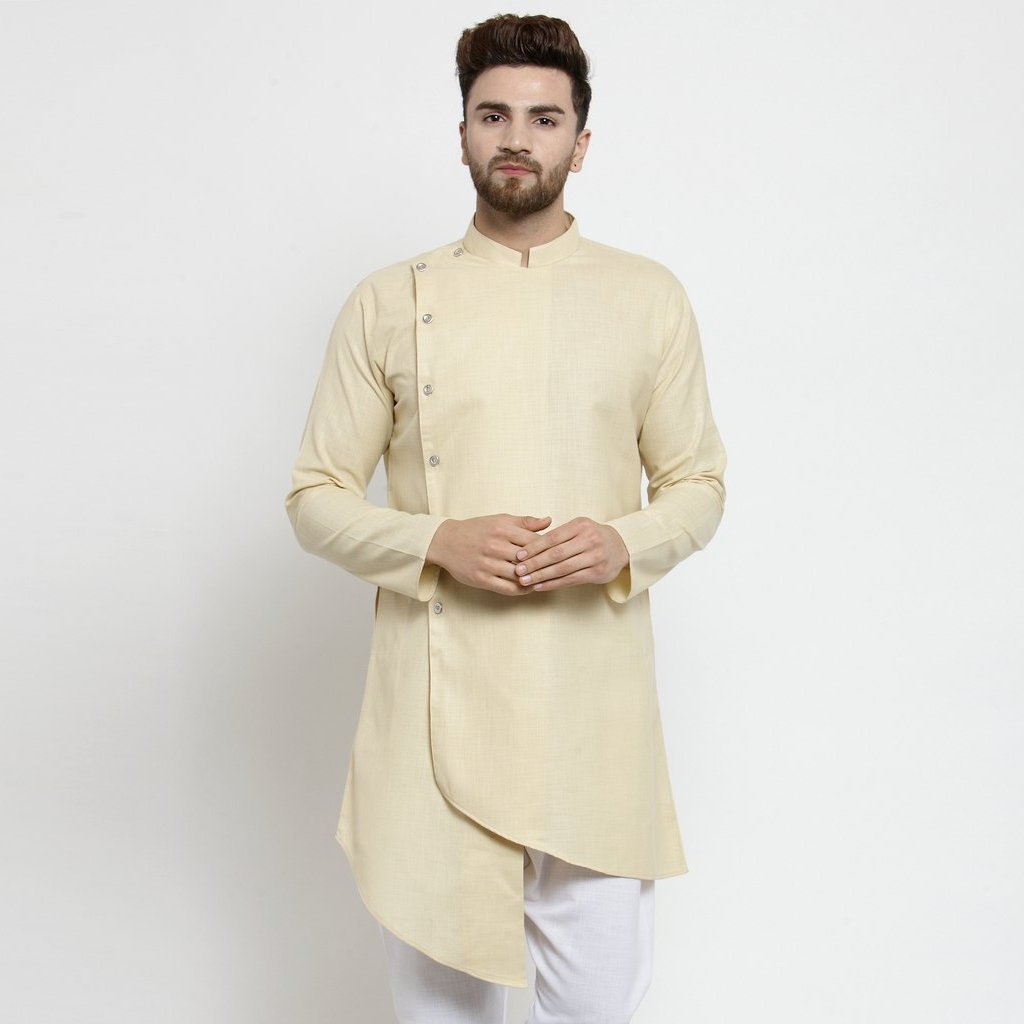Men's Beige Solid  Cotton Kurta Pajama Set