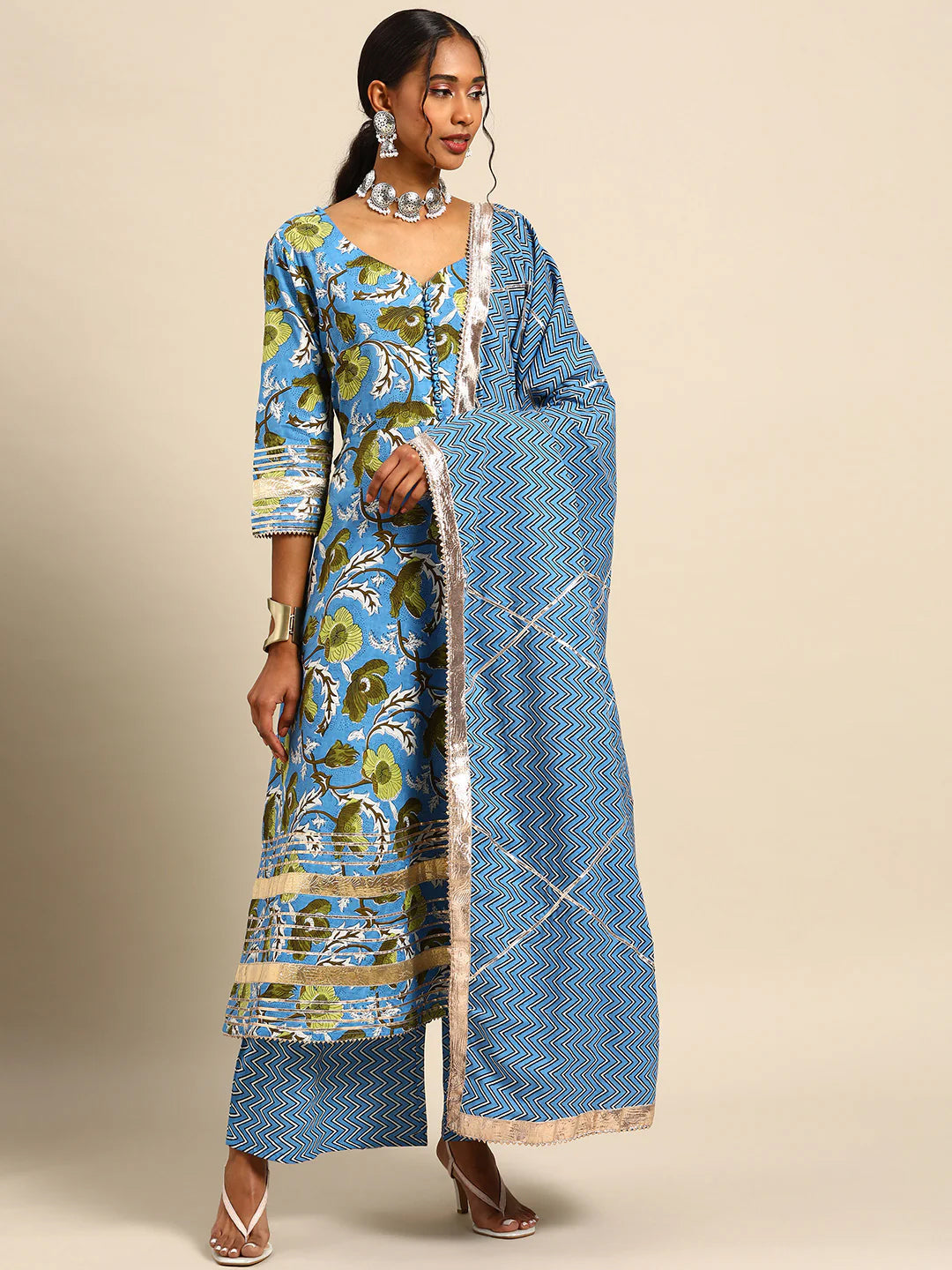 Readymade Rayon Aqua Blue A-Line Kurti Palazzo With Dupatta