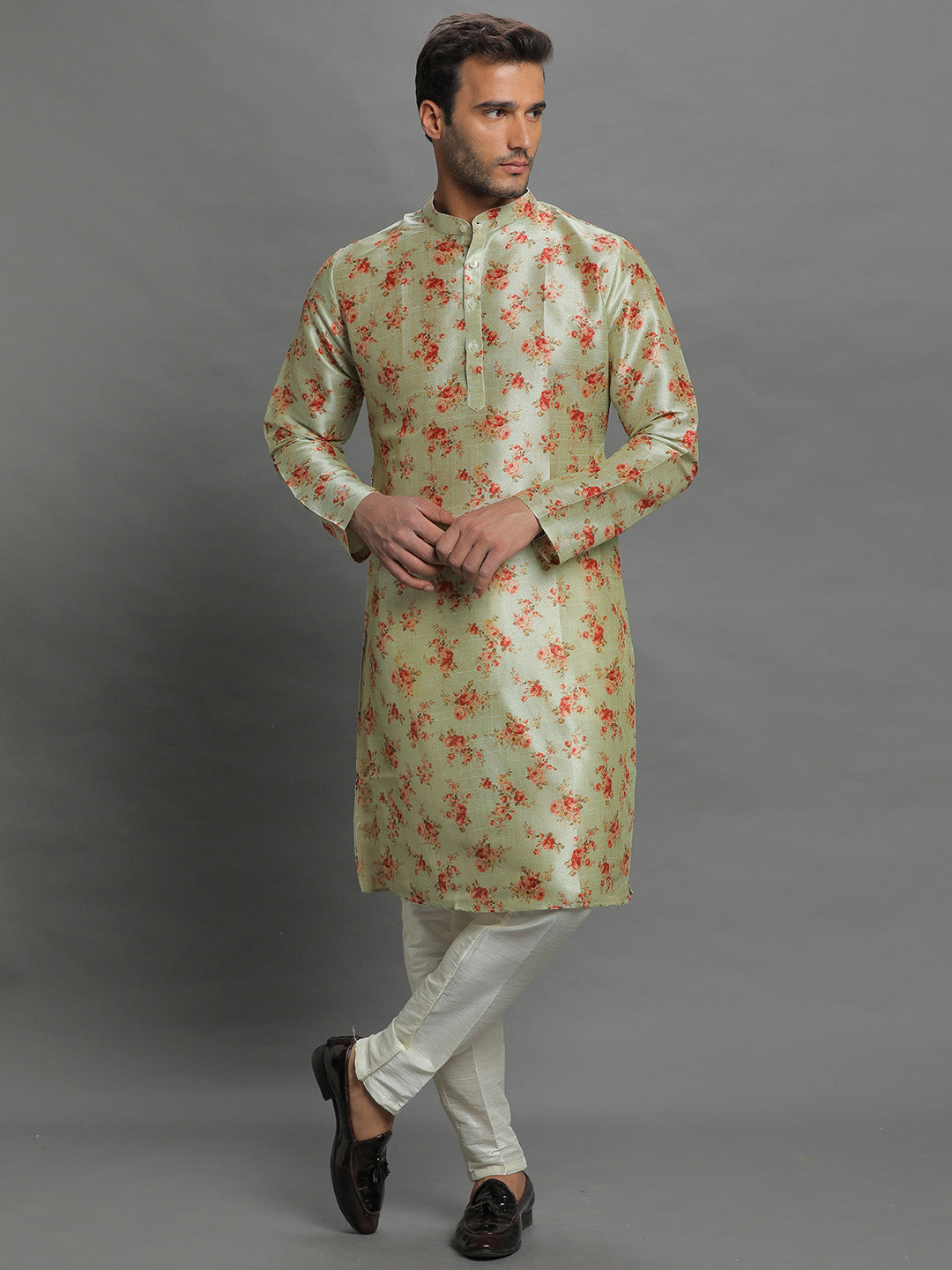 Men's Olive Green Printed Cotton Kurta Pajama Set