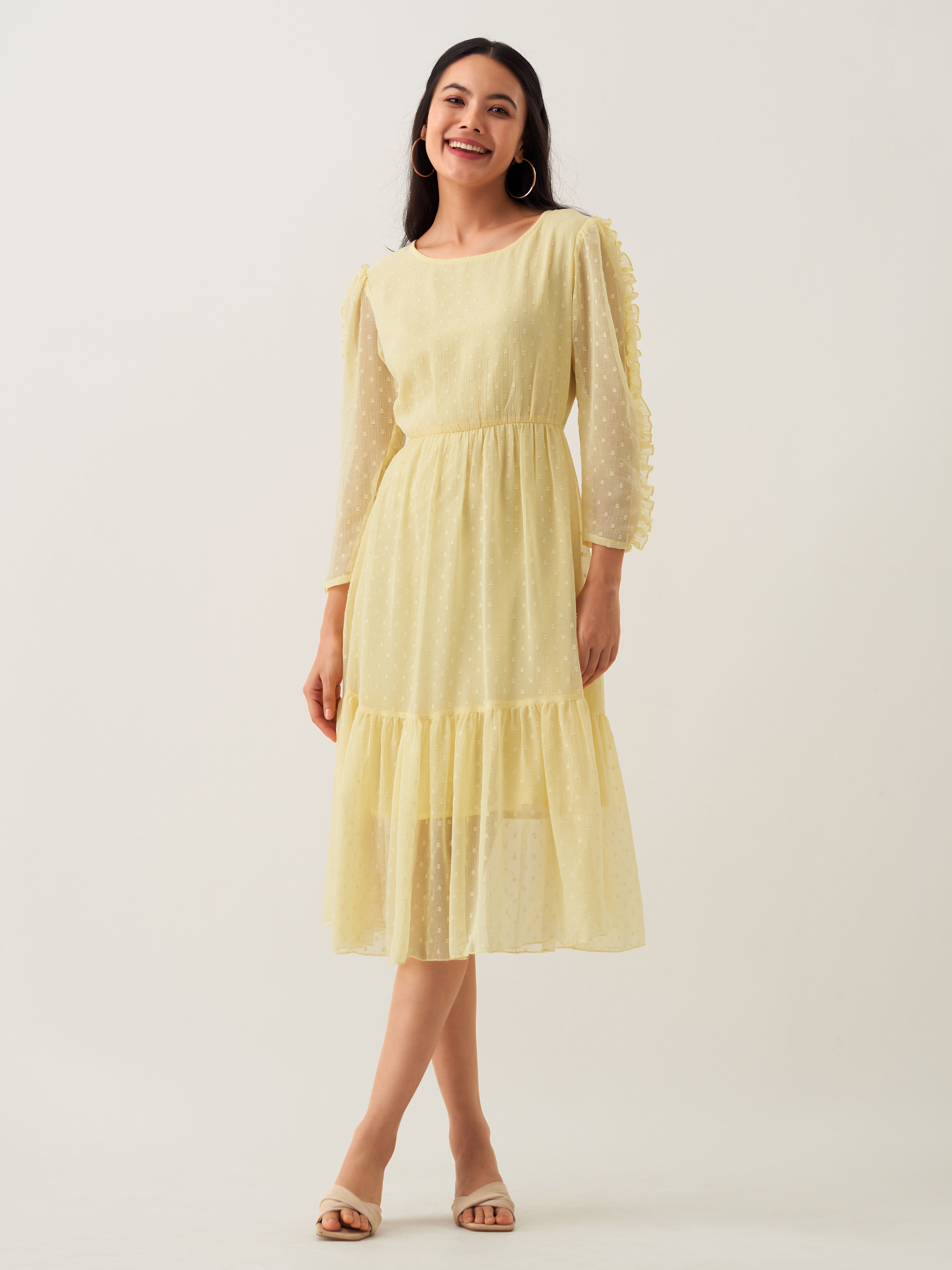 Light Yellow Chiffon Brasso Swiss Dot Round Neck Dress
