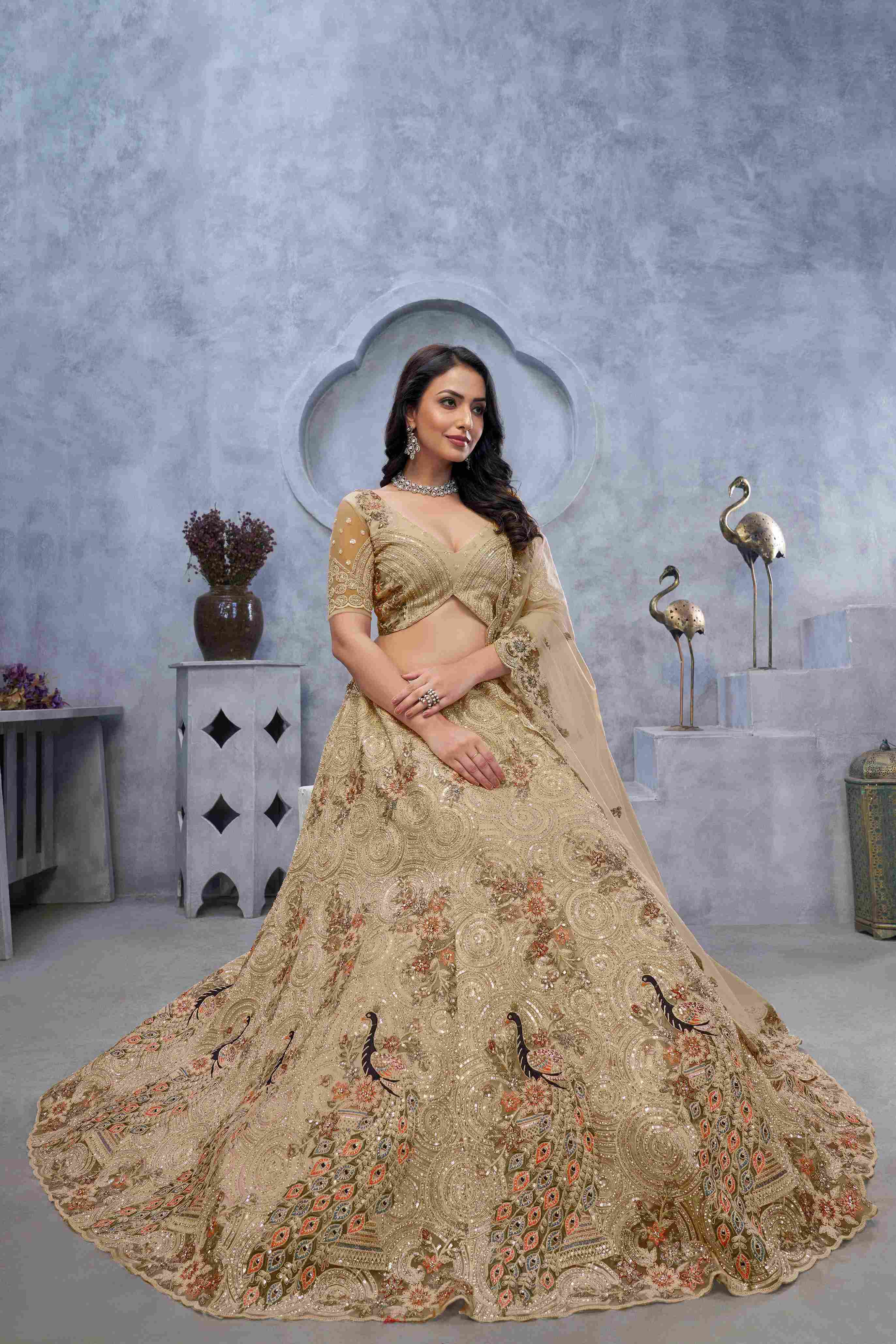 Golden Soft Net Embroidered Peacock Motif Lehenga Choli