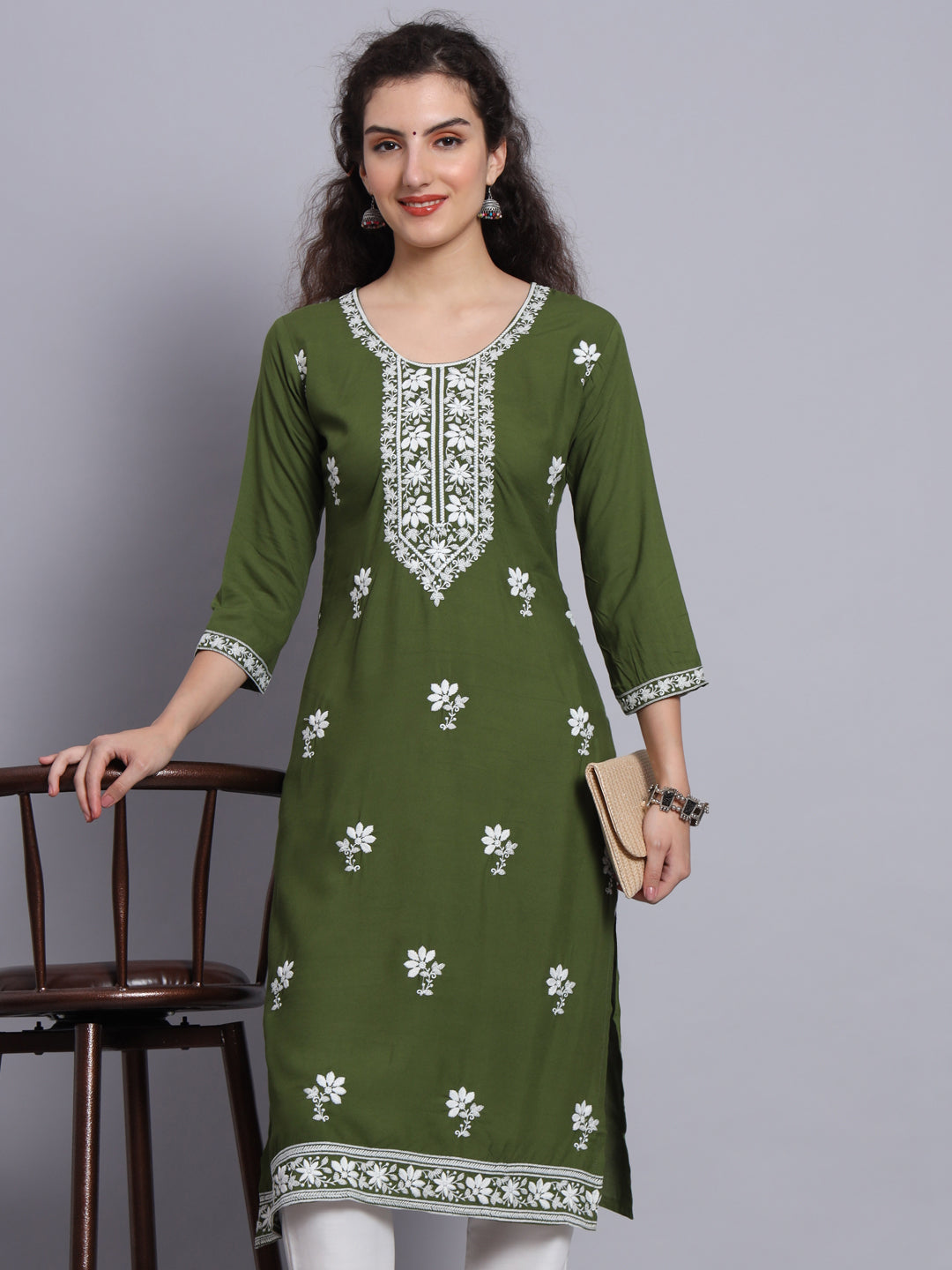 Green Rayon Lucknowi Chikankari Embroidered Kurti