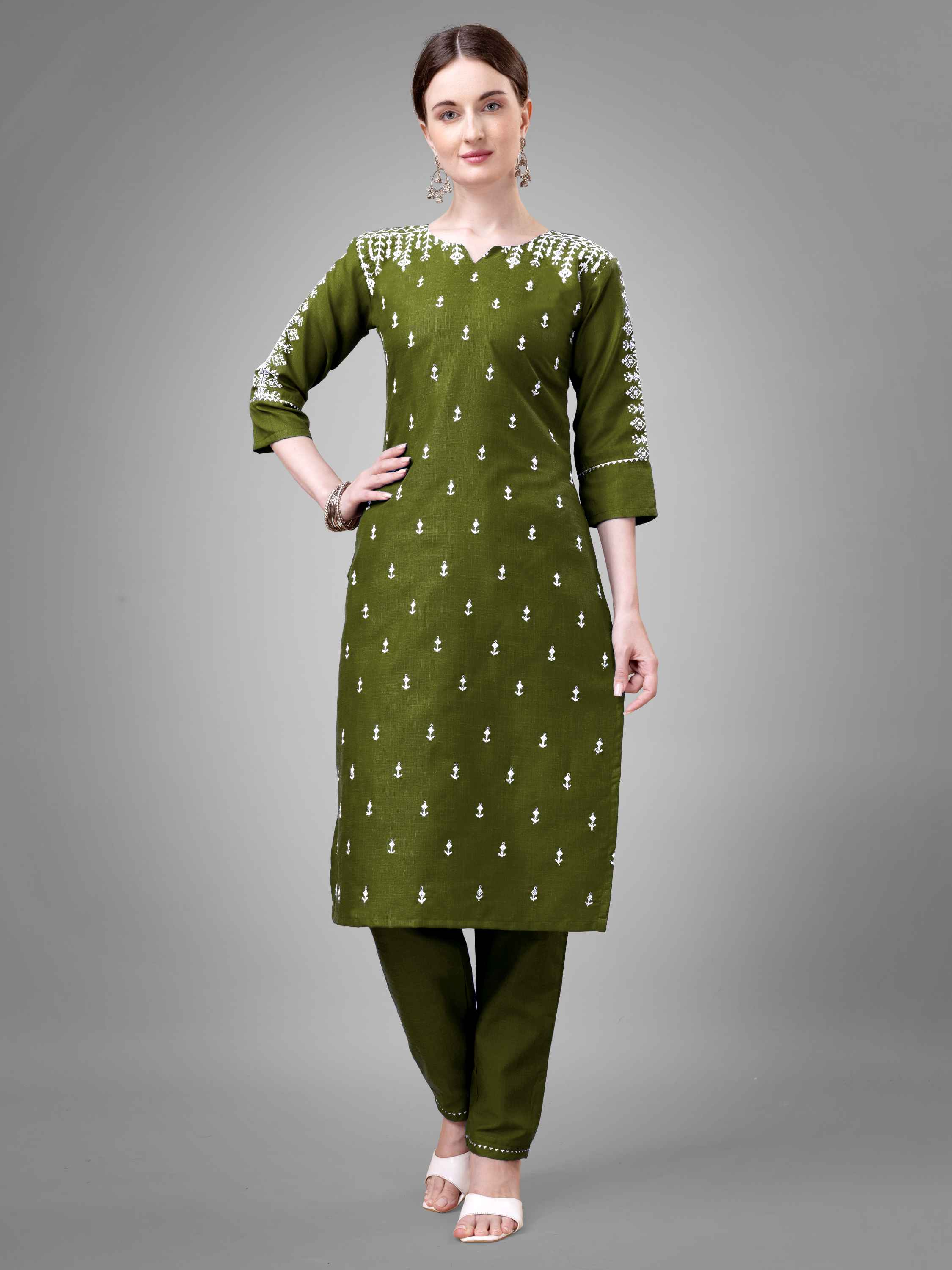 Olive Green Cotton Blend Embroidered Kurti With Pant