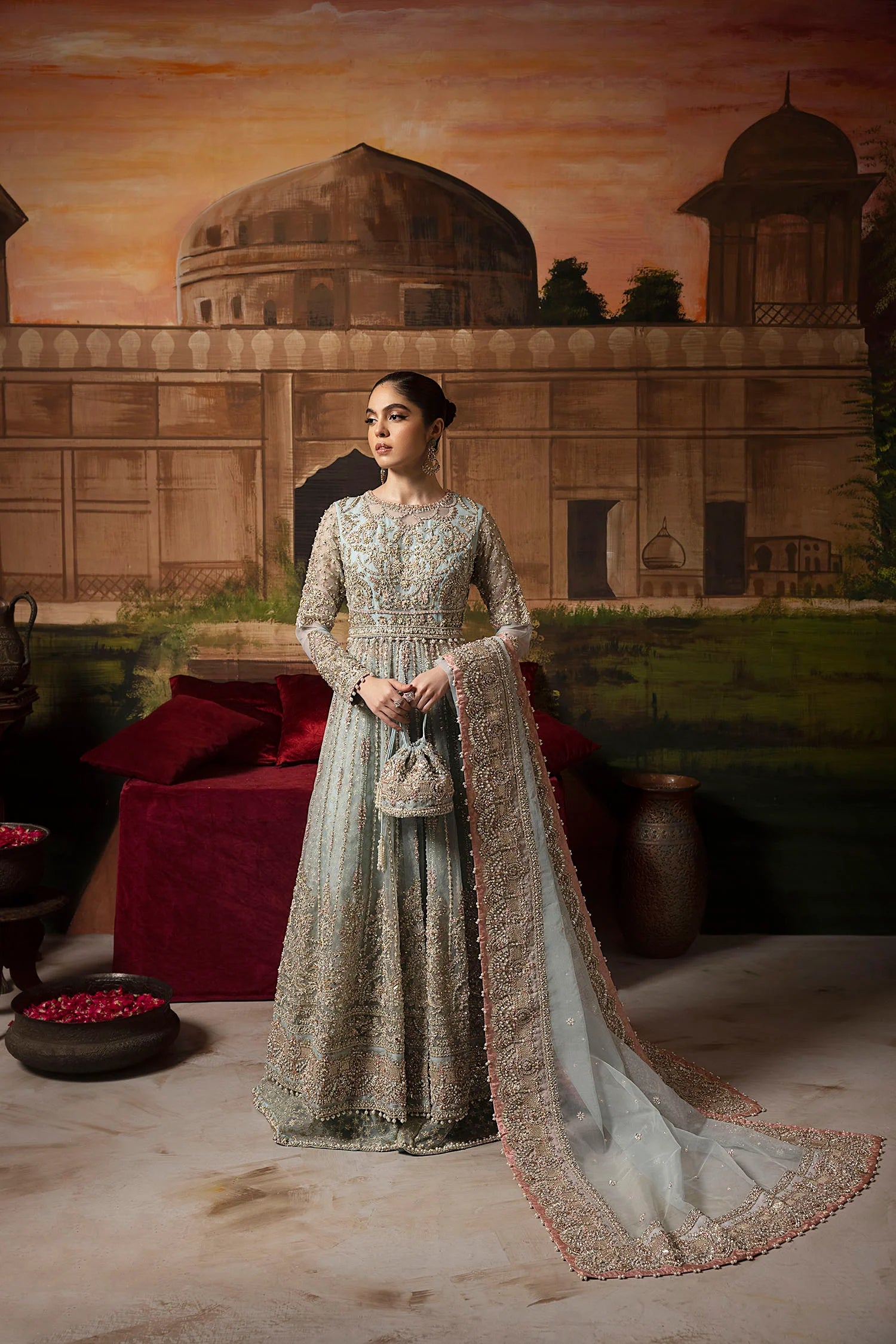 A Delicate Consonance of Juvenile and Effeminateness, 'serene' is Etched Into a Grandiose Ice Blue Ensemble, This Masterpiece Features a Front-open Organza Pishwas Rendered With Adornments of Light Gold Tilla and Sequins Hand Embellished With Sparkling Dabka Work, Stones, Crystals and Resham Work. Enhancing Its Beauty With a Beautiful Sharara and a Gracefully Draped Dupatta With Heavily Embellished Border, This Luxurious Outfit Will Inundate You in an Incredible Embodiment of Majesty With Its Celestial Beauty.