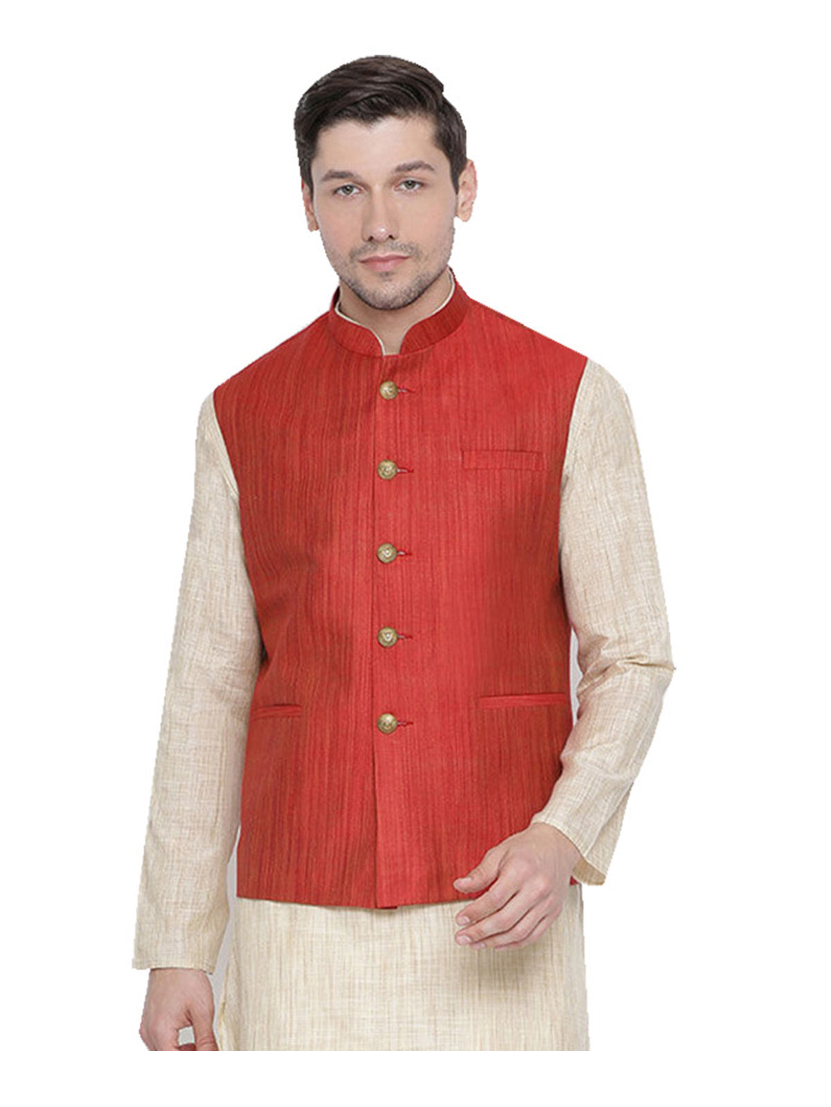 Men's Red Nehru Jacket Banglori Silk Jodhpuri Mandarin Collar Sleeveless Solid Waistcoat