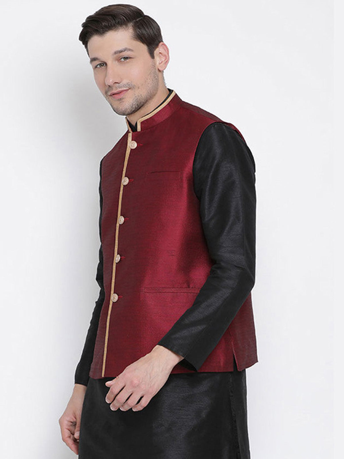 Men's maroon Nehru Jacket Banglori Silk Jodhpuri Mandarin Collar Sleeveless Solid Waistcoat
