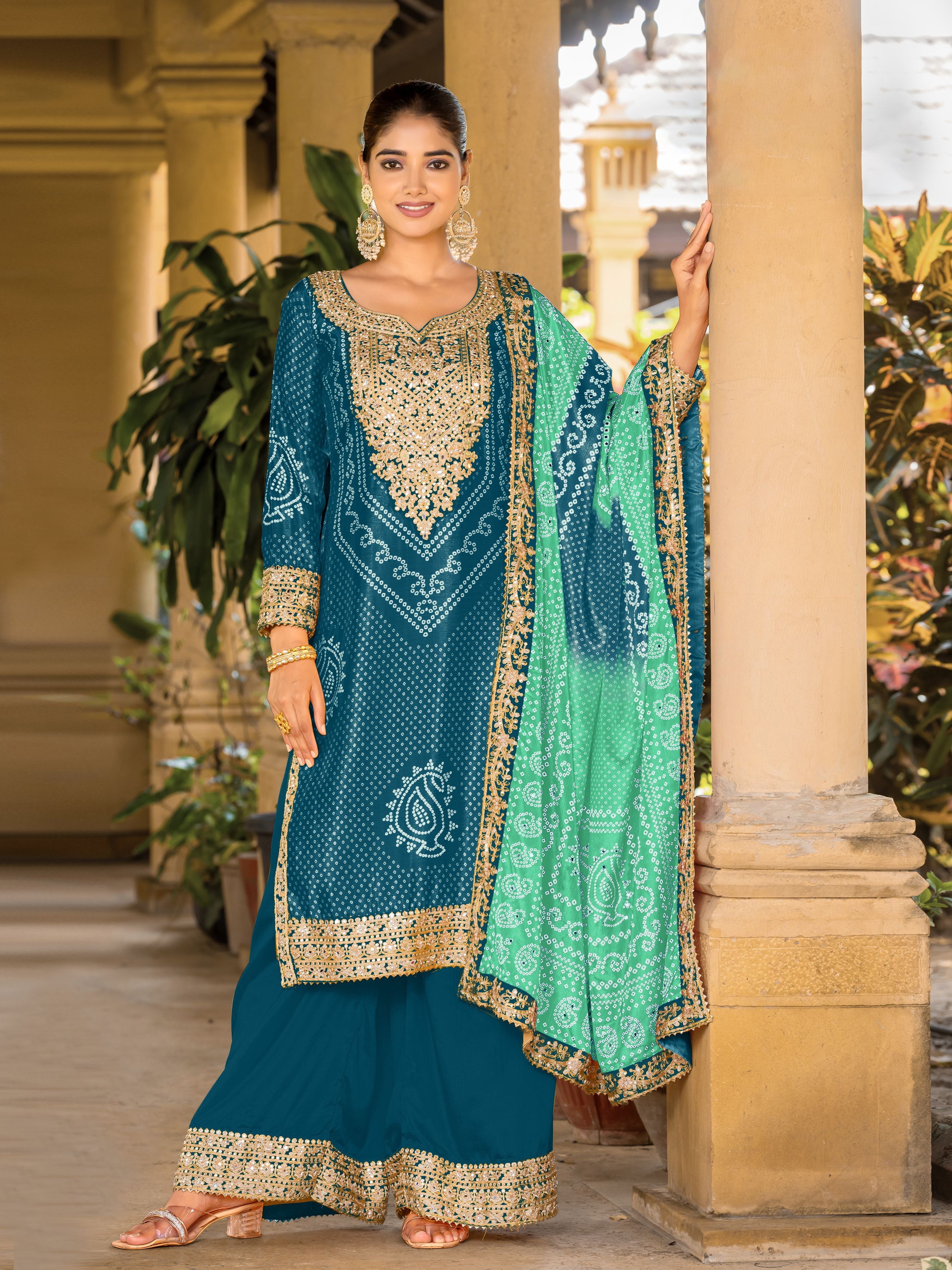 Teal Chinon Bandhani Embroidered Kurti With Sharara Dupatta