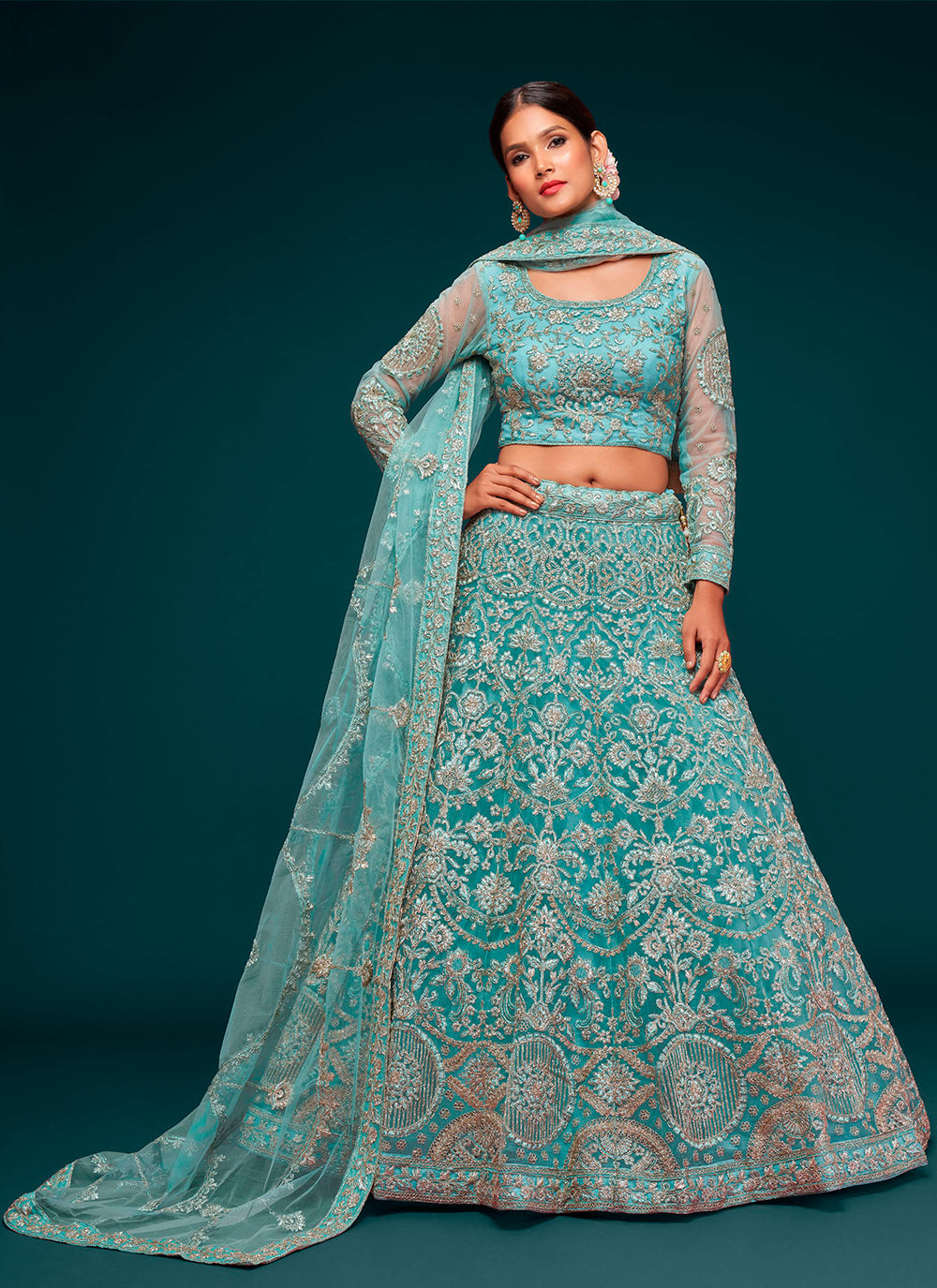 Aqua Zari Embroidered Net Lehenga Choli
