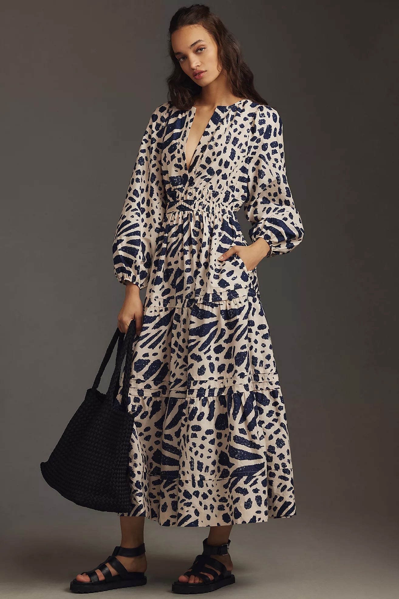 Beige Poly Rayon Balloon Sleeve V-Neck Printed Maxi Casual Dress
