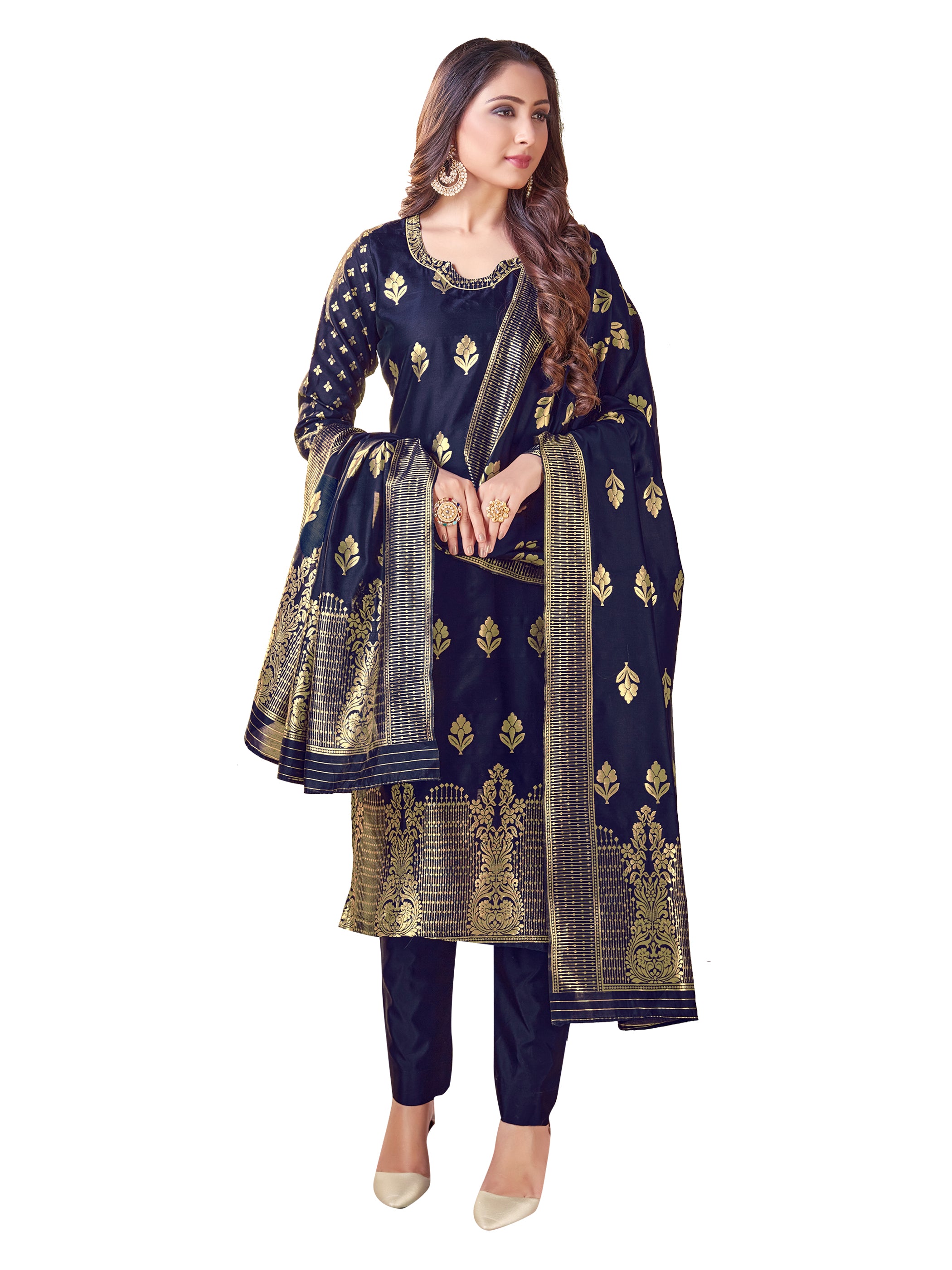 Navy Blue Banarasi Art Silk Woven Salwar Suit