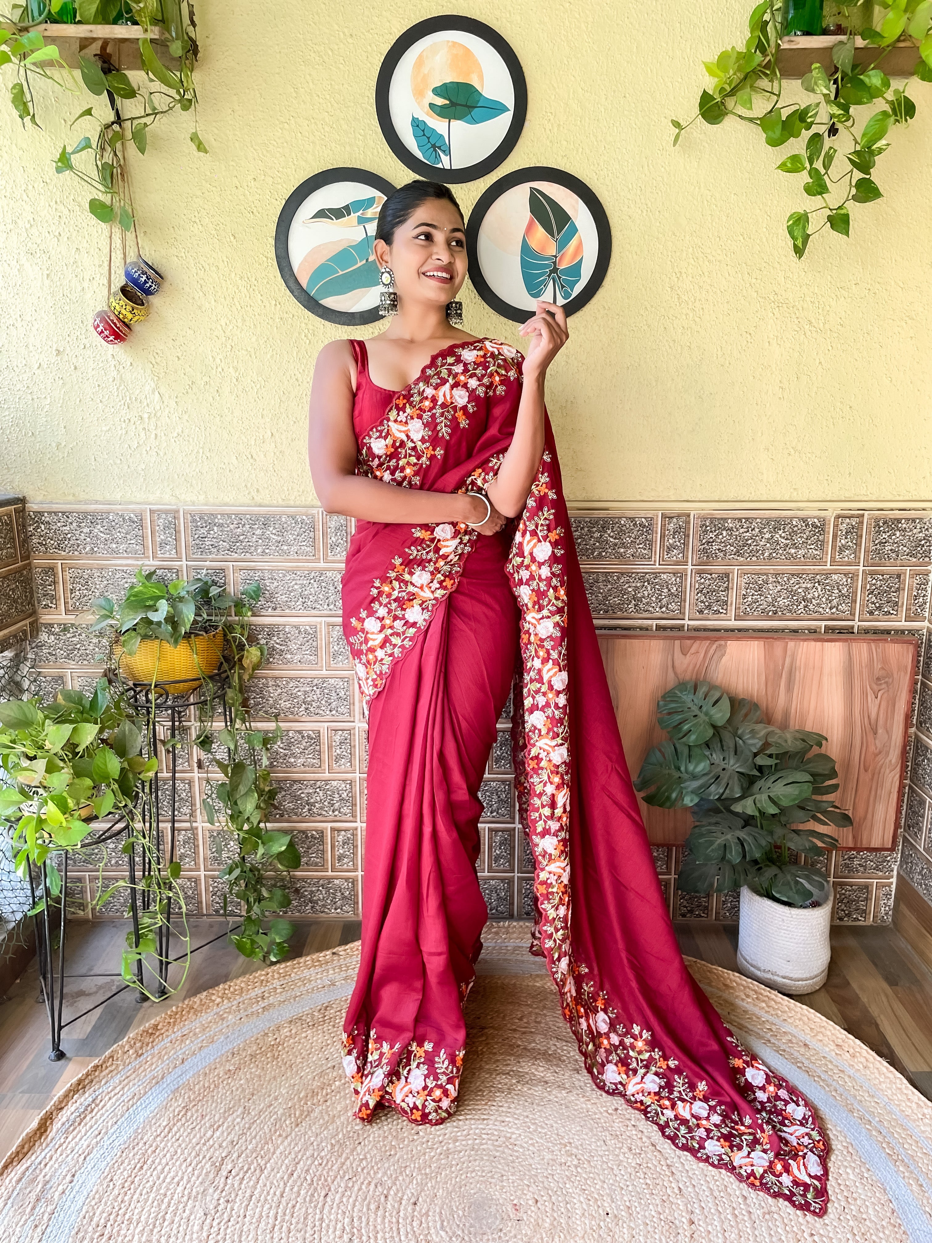 Maroon Vichitra Silk Sequins Embroidered Saree