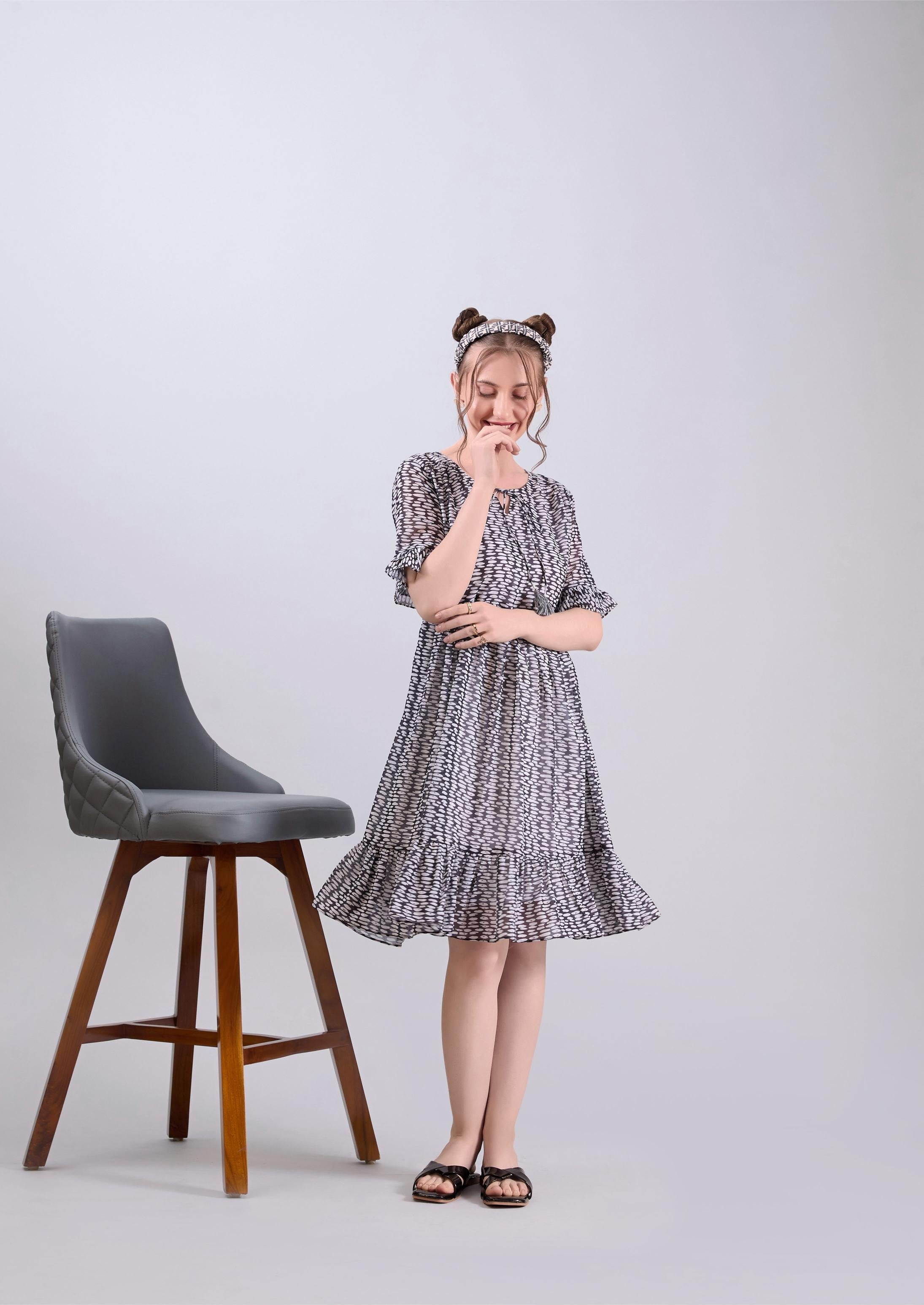 Multicolor Poly Georgette Round Neck Tie Up Printed Dress