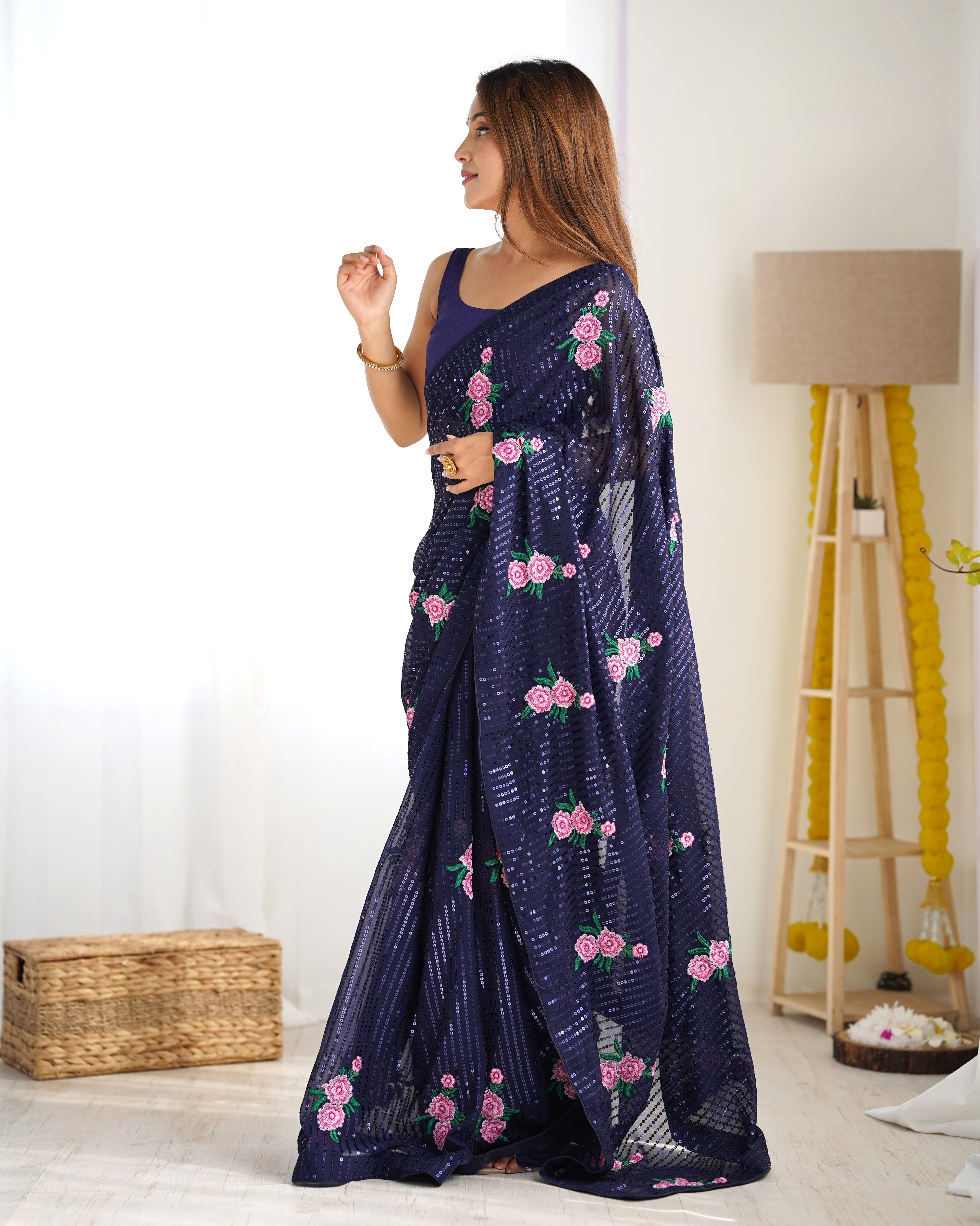 Navy Blue Georgette Thread Sequins Embroidered Saree