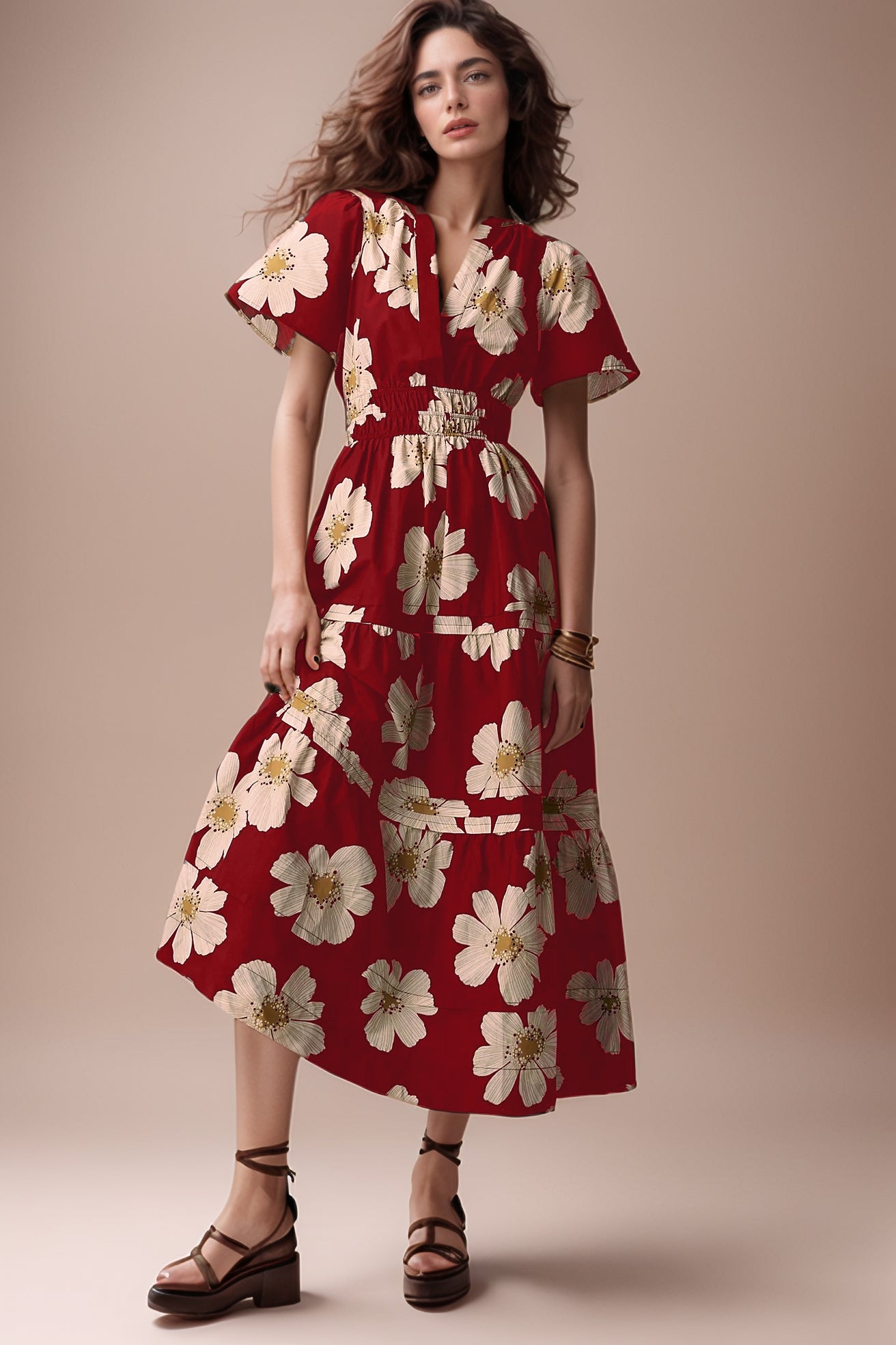 Red Poly Rayon V-Neck Printed Knee Long Casual Dress