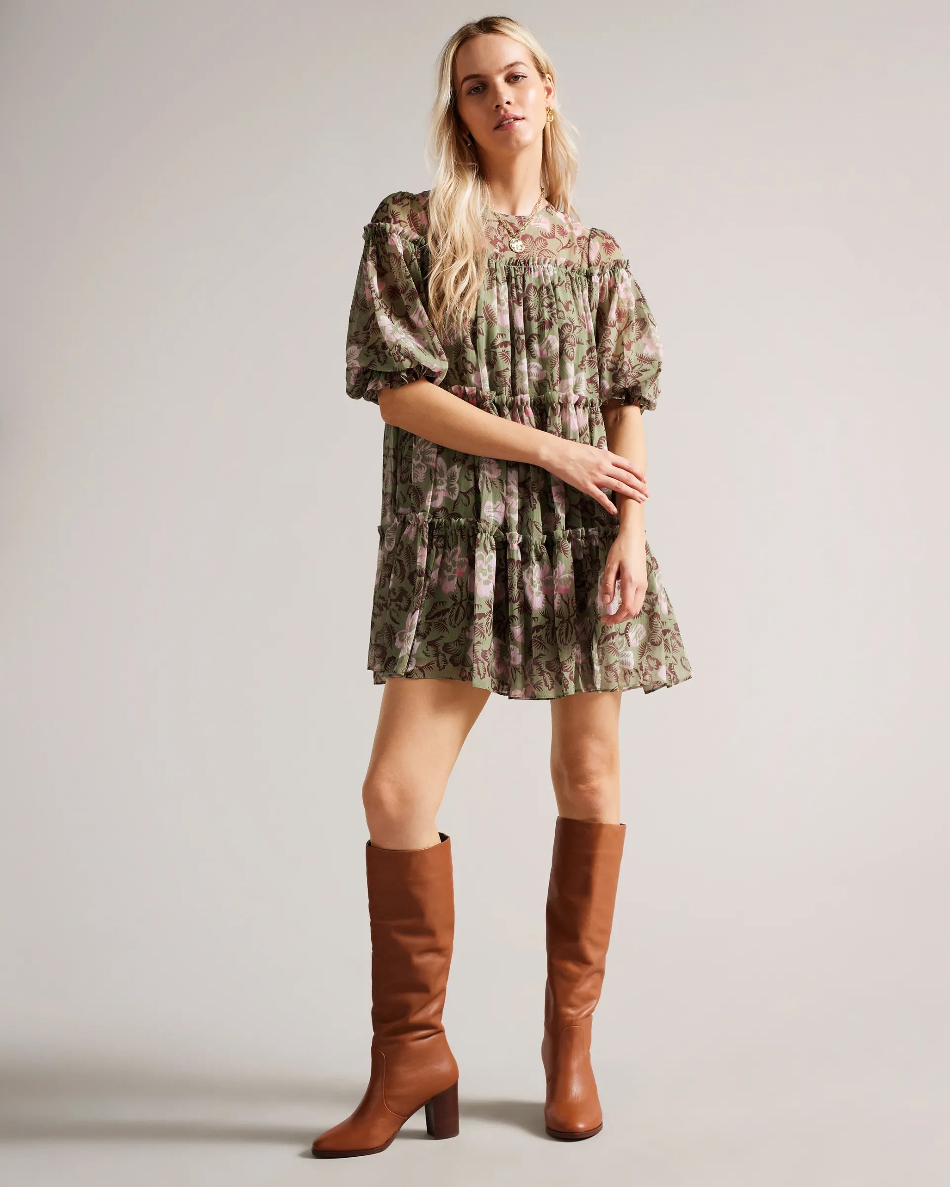 Georgette Short Sleeve Puff Cowl Neck Printed Short Boho Casual Dress