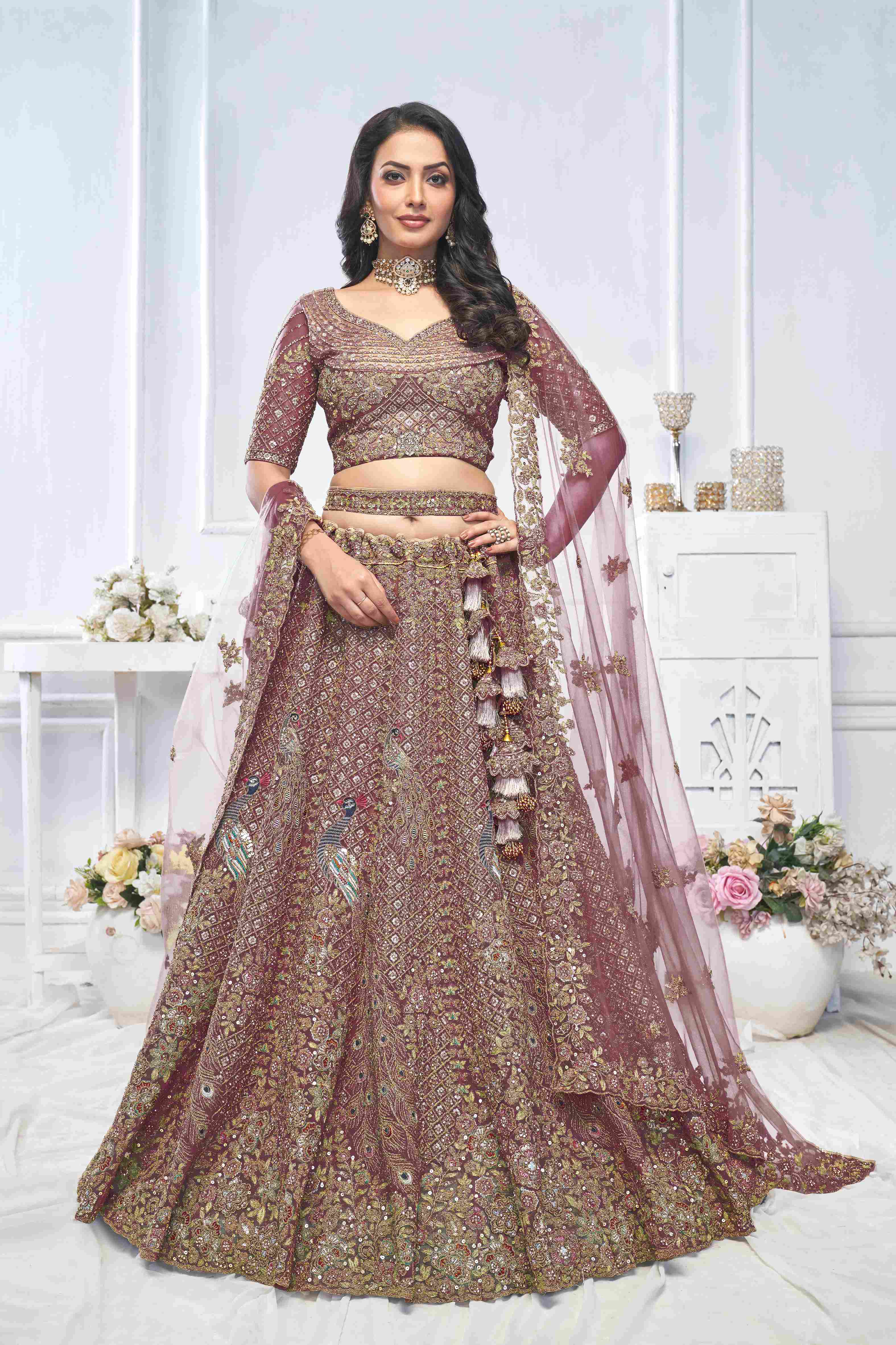 Dark Purple Soft Net Embroidered Sequins Peacock Motif Lehenga Choli