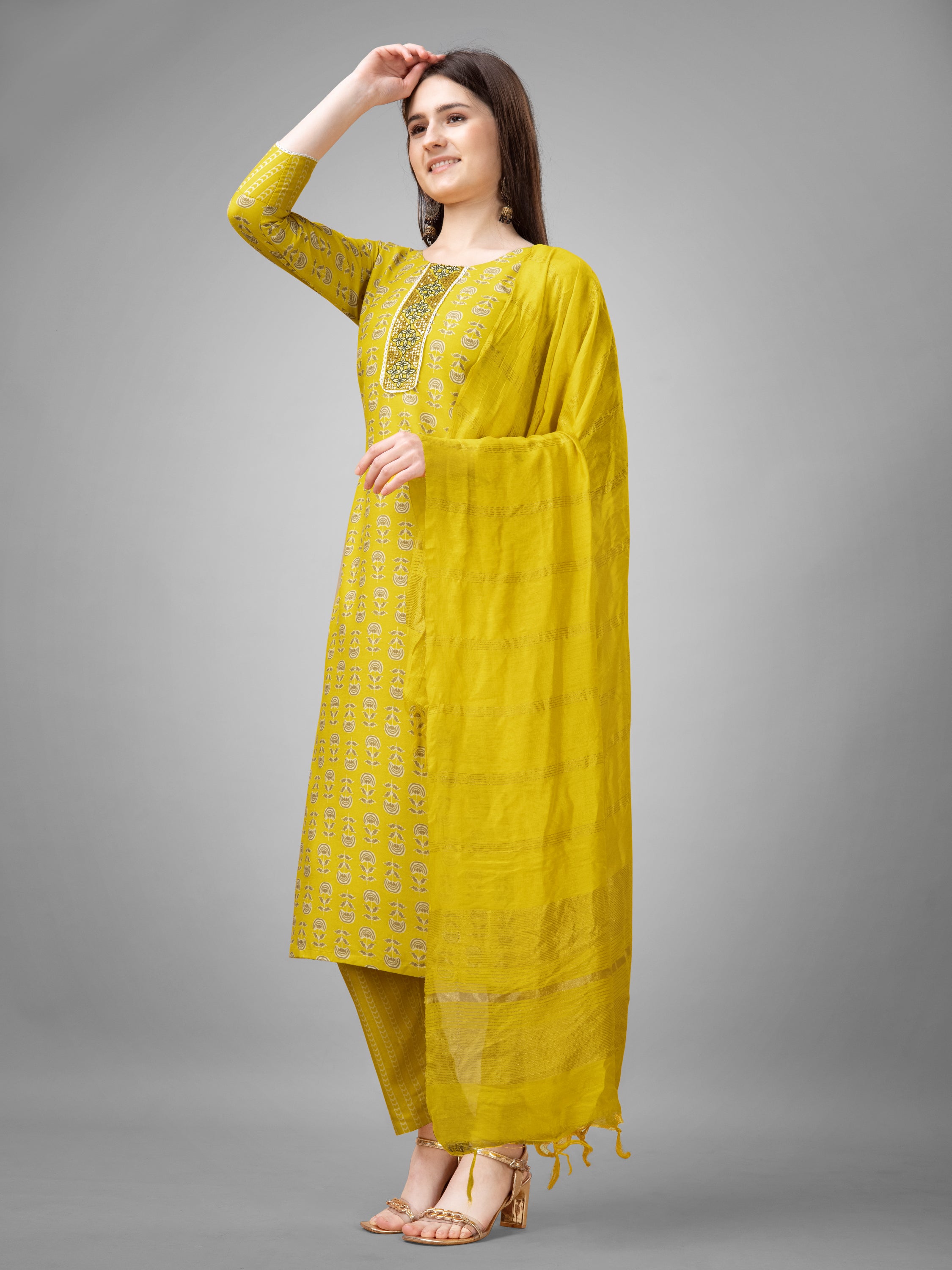 Yellow Rayon Printed Salwar Suit With Pant Dupatta