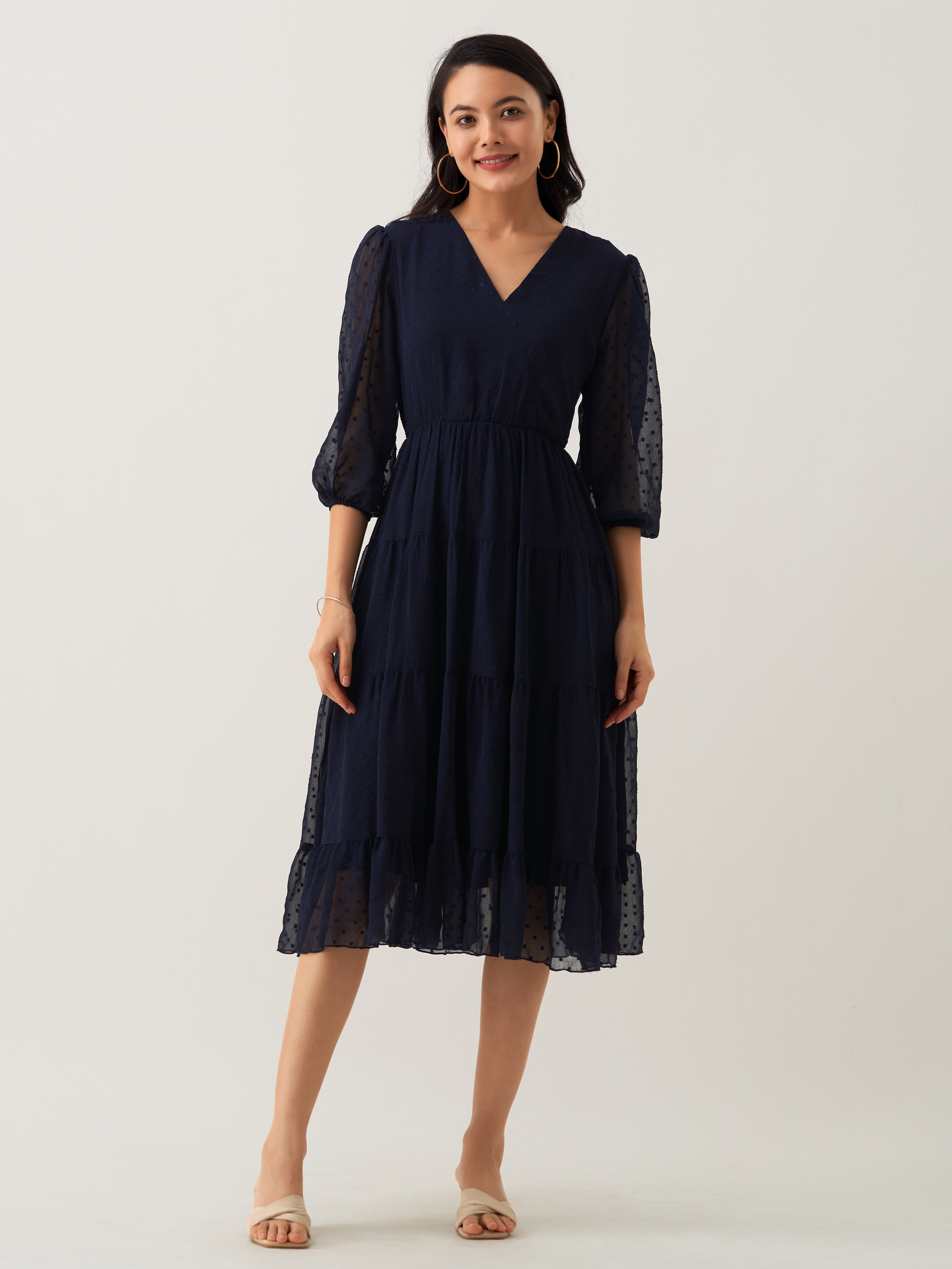 Navy Blue Chiffon Brasso Swiss Dot V-Neck Dress