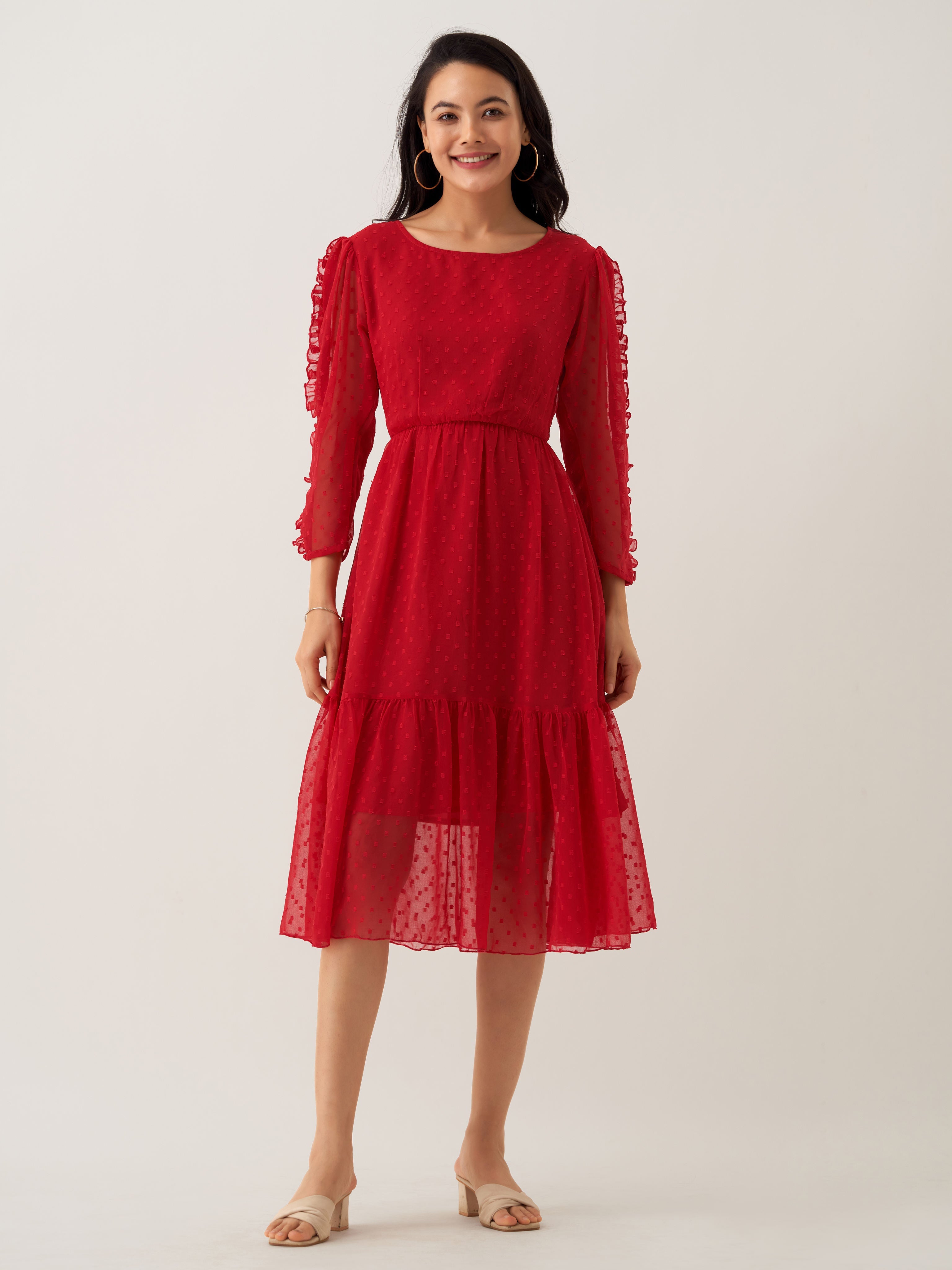 Red Wine Chiffon Brasso Swiss Dot Round Neck Dress