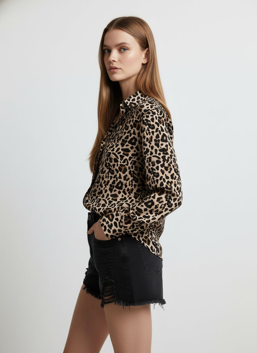 Cream & Black Poly Crepe Animal Printed Shirt