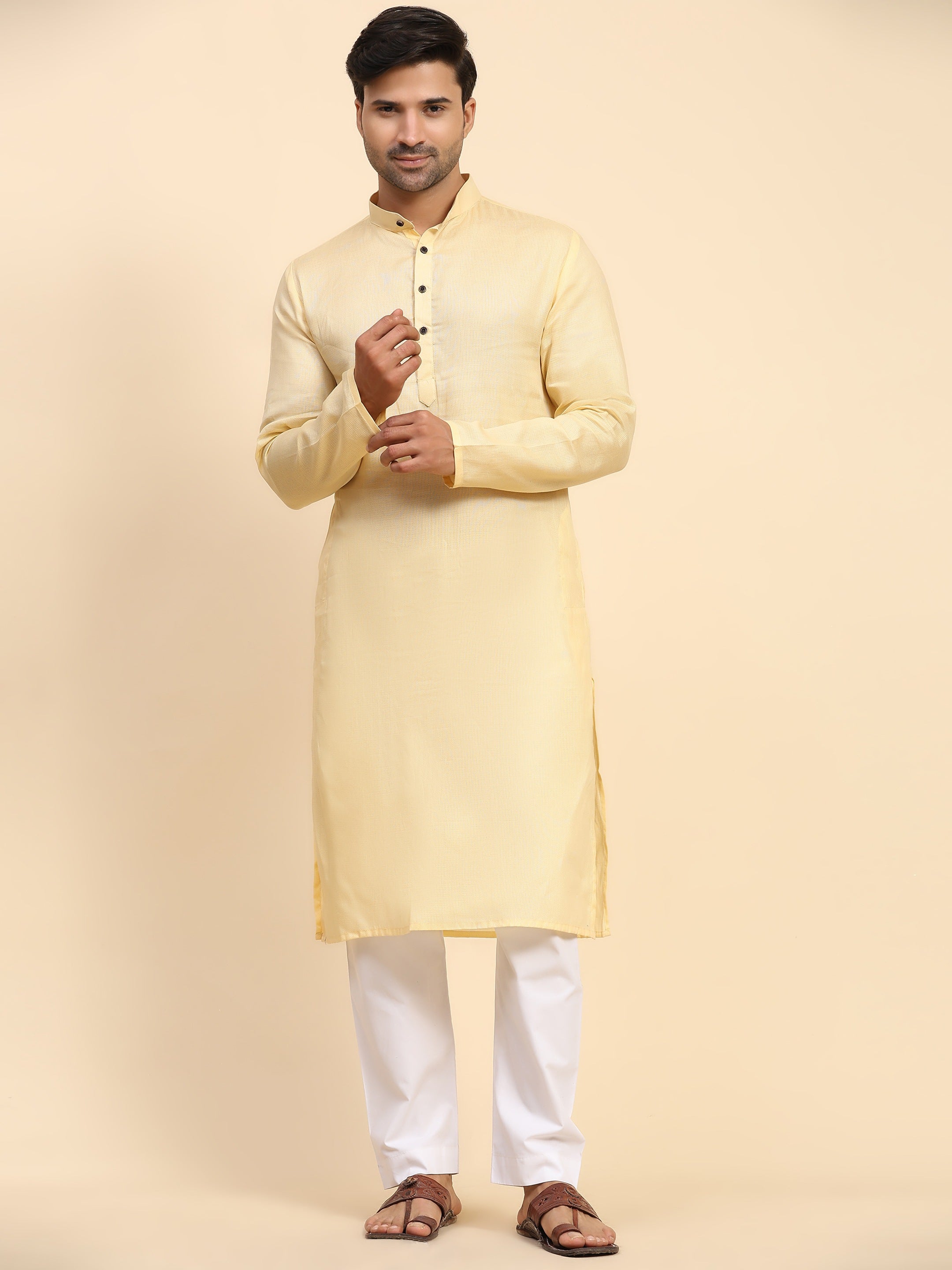 Men's Creamish Yellow Pure Cotton Woven Kurta Pajama Set