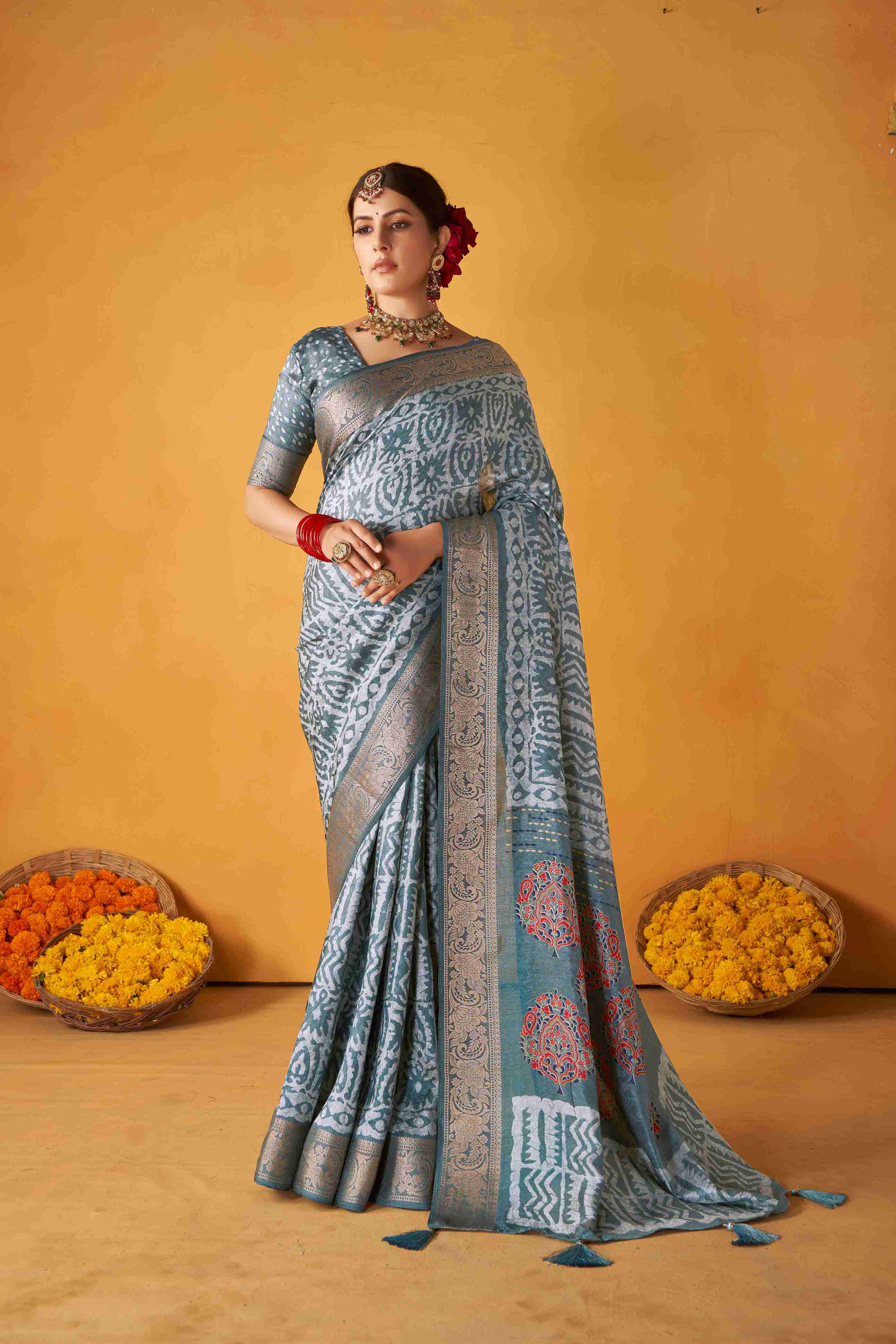 Sari en soie batik Davy Grey Tussar imprimé avec tissage jacquard