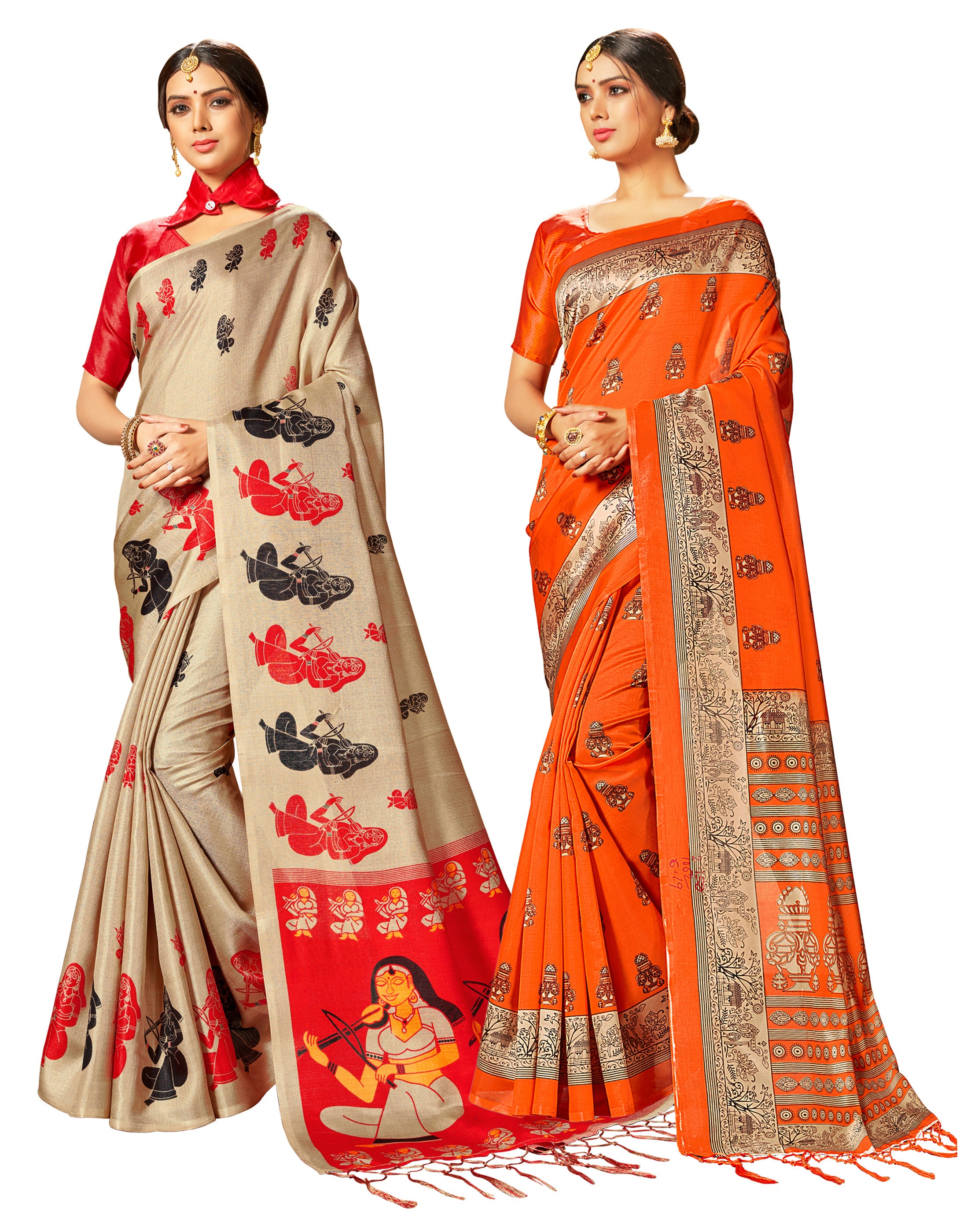 • Couleur du sari : 1) Premier sari beige, 2) Deuxième sari orange