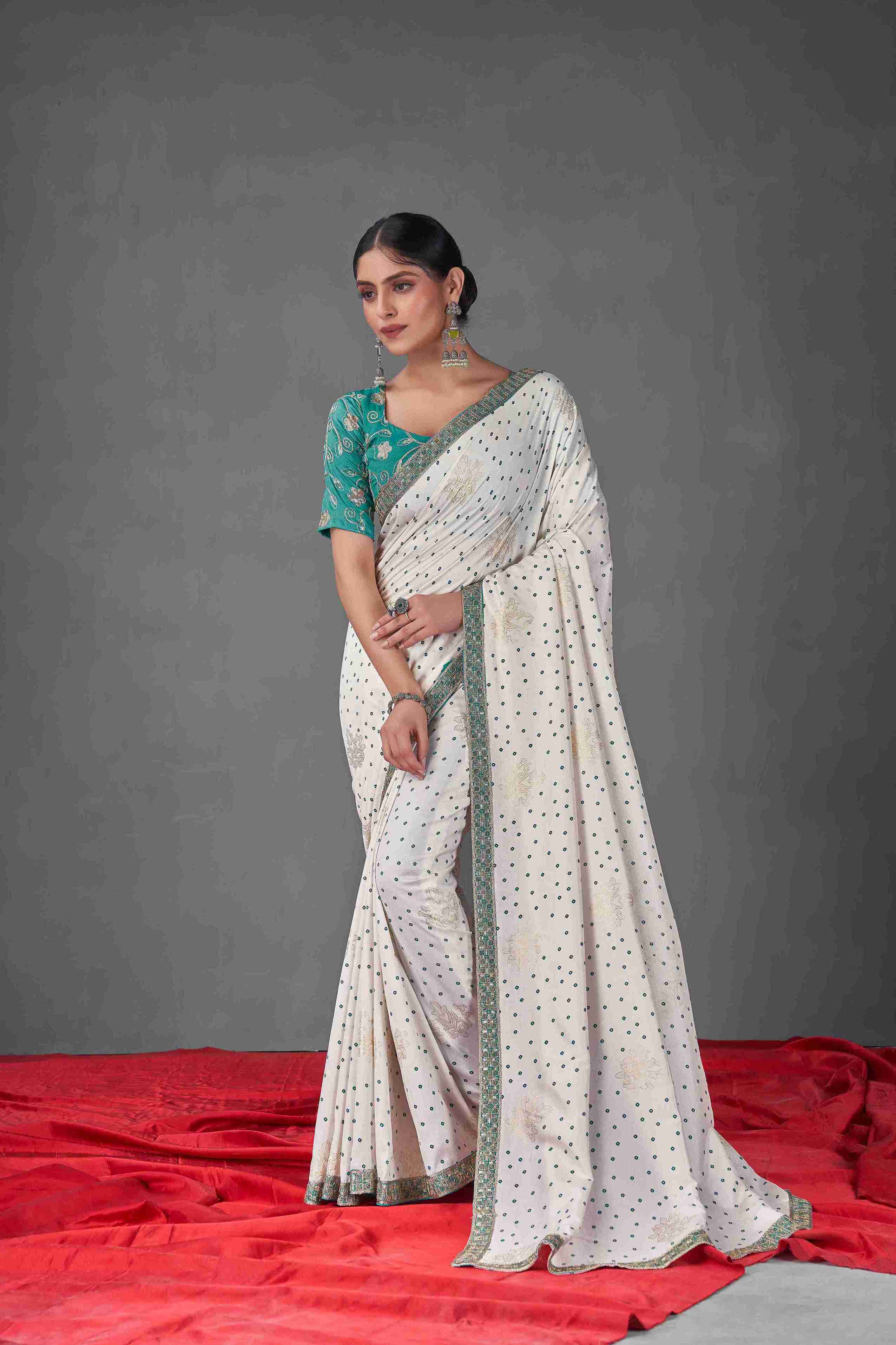 Sari imprimé Bandhani en soie Tussar vert d'eau blanc cassé