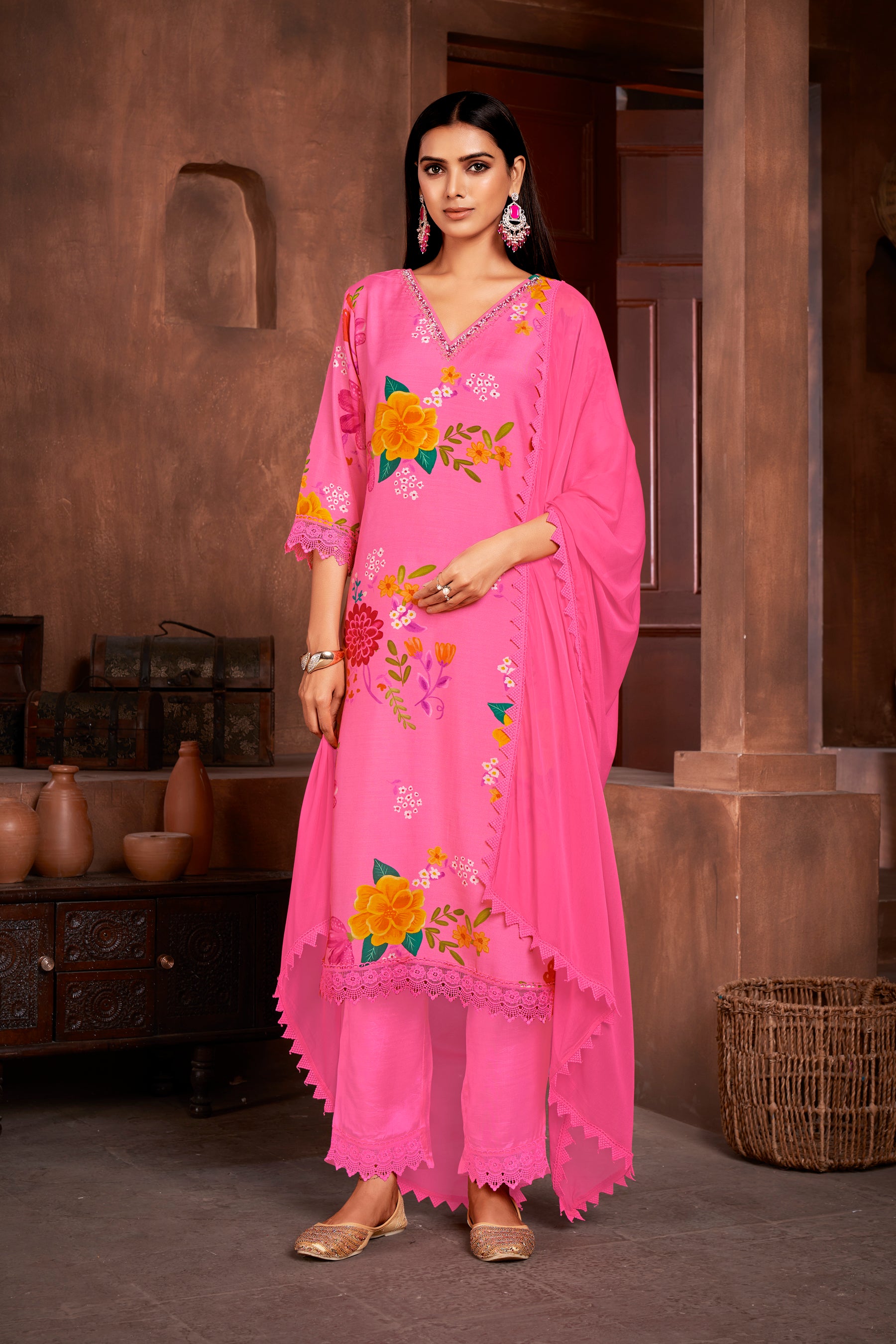 Costume Salwar imprimé en mousseline rose avec dentelle brodée et pantalon Dupatta