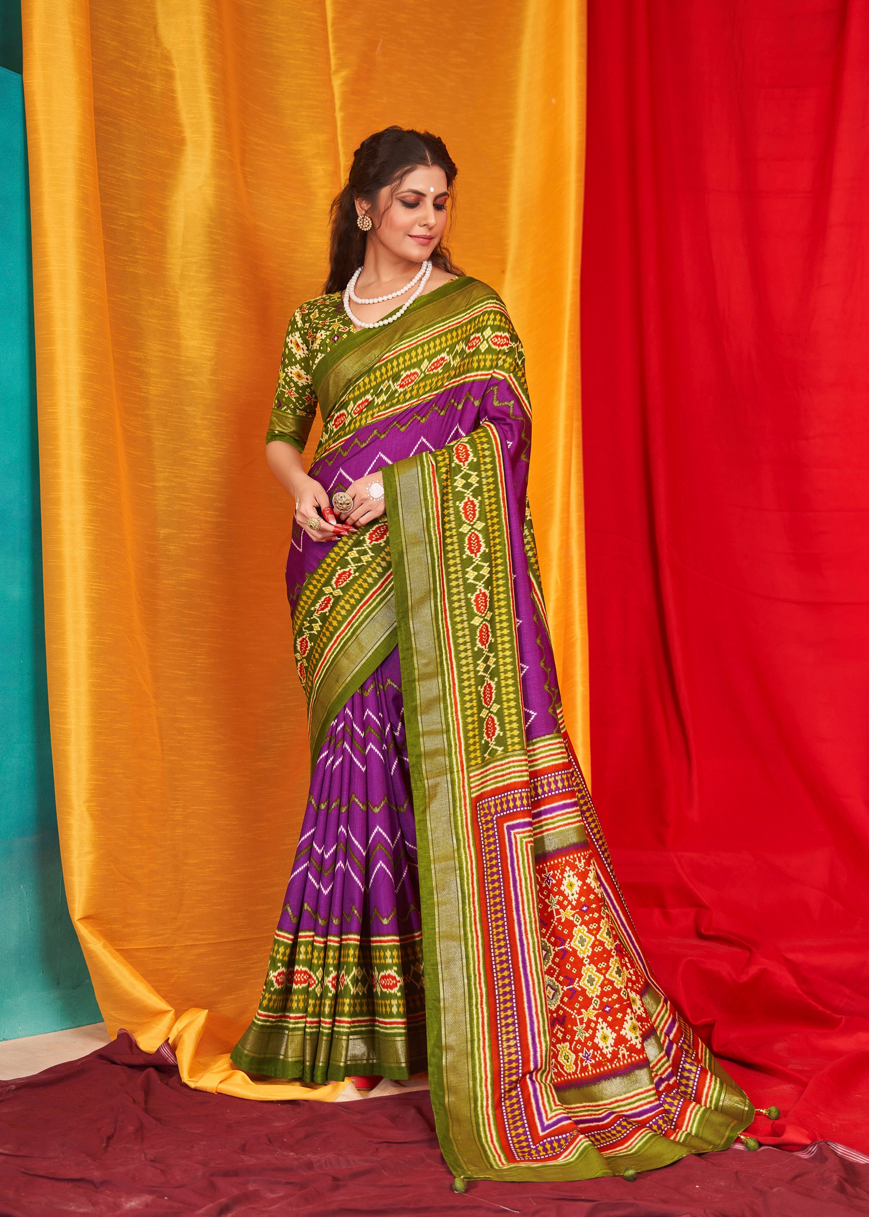Saree imprimé Patola en soie Tusser en velours violet