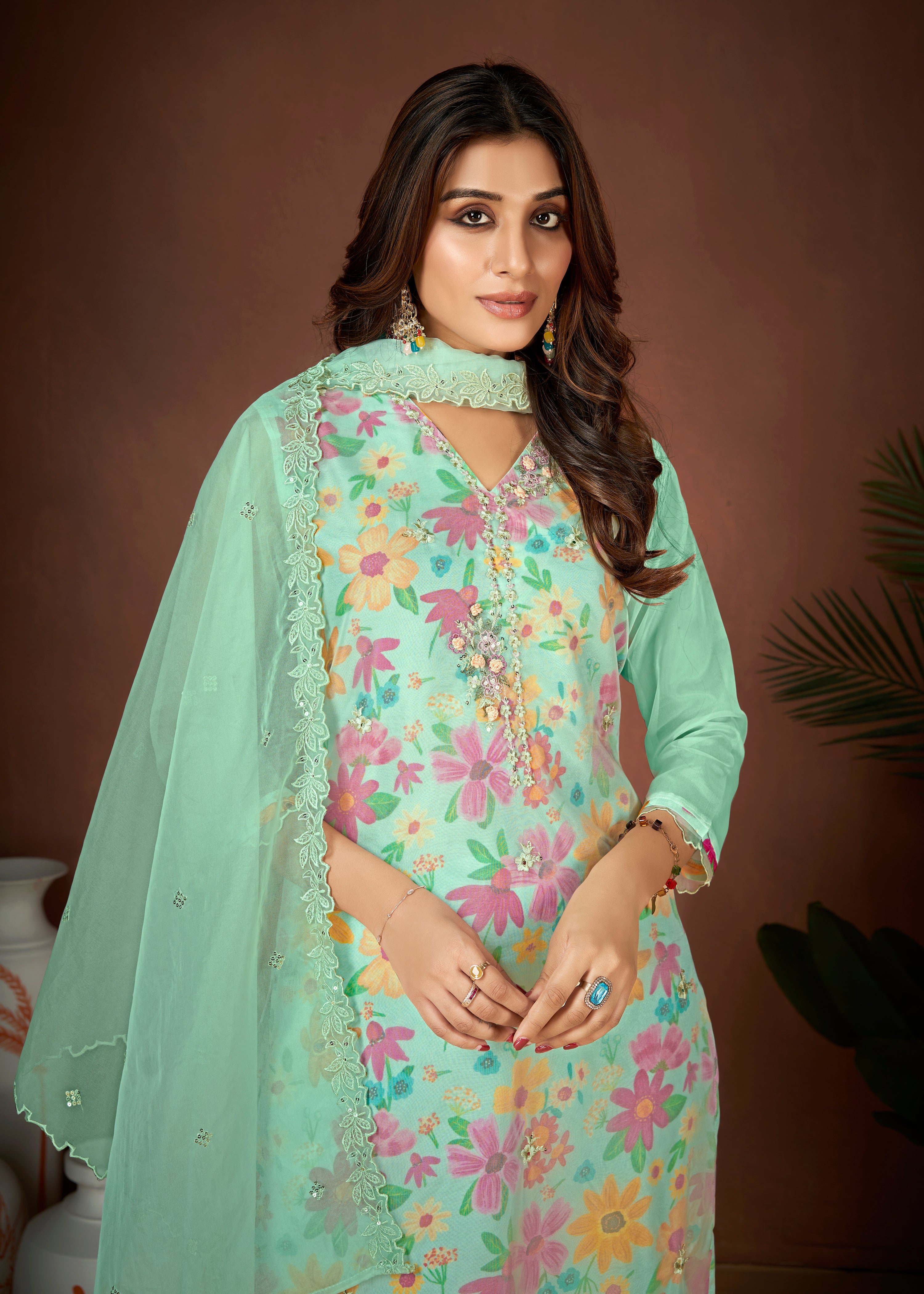 Costume Salwar à imprimé numérique en organza vert de mer avec pantalon Dupatta