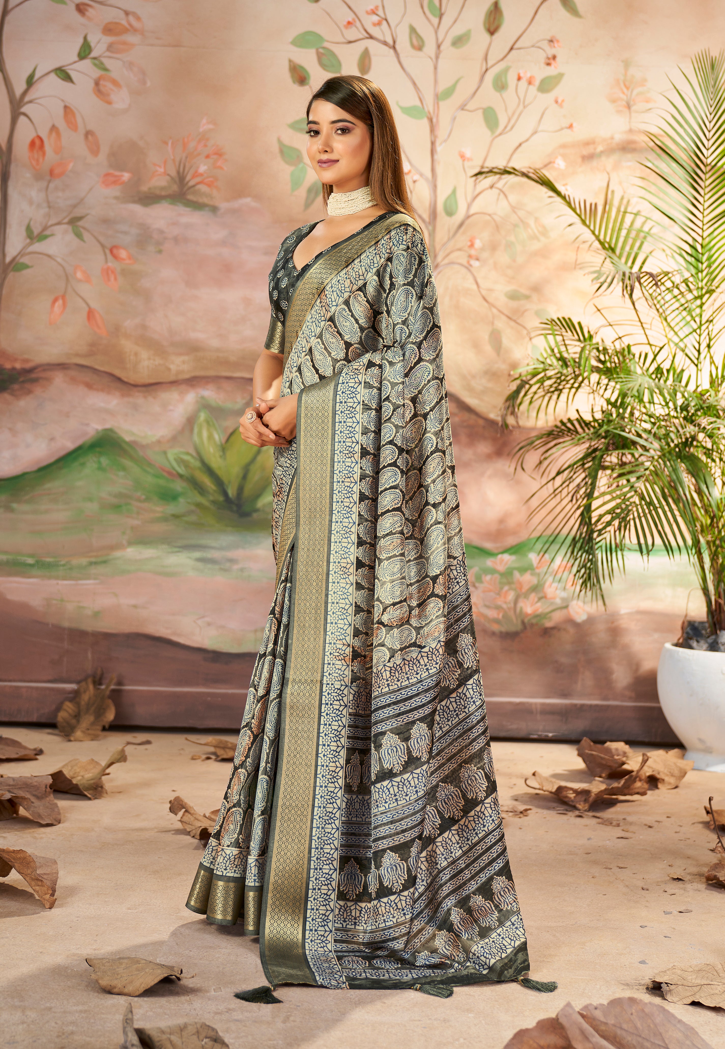 Sari en soie imprimé cachemire Dola gris carbone