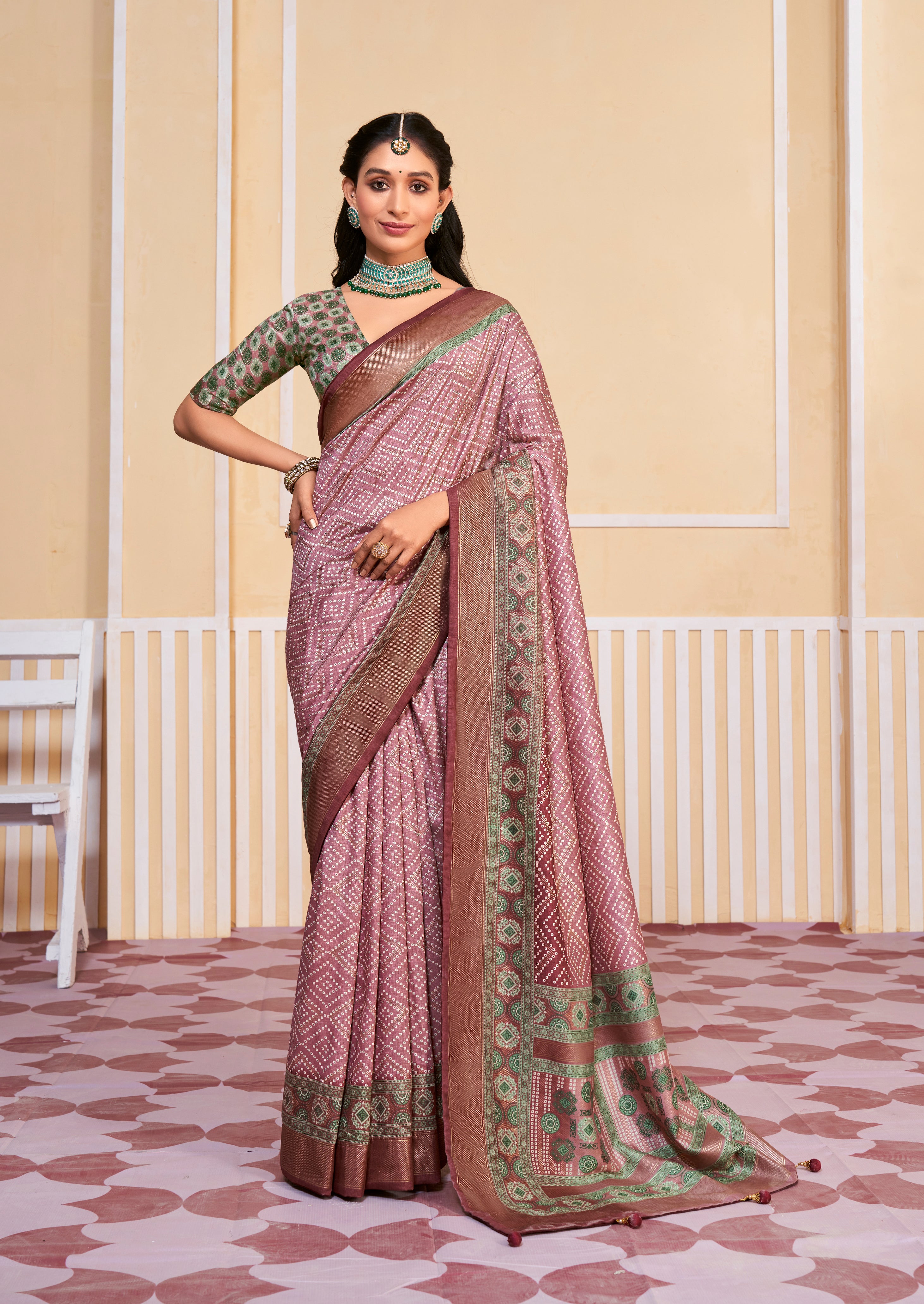 Sari imprimé Bandhani en soie Tussar rose terne