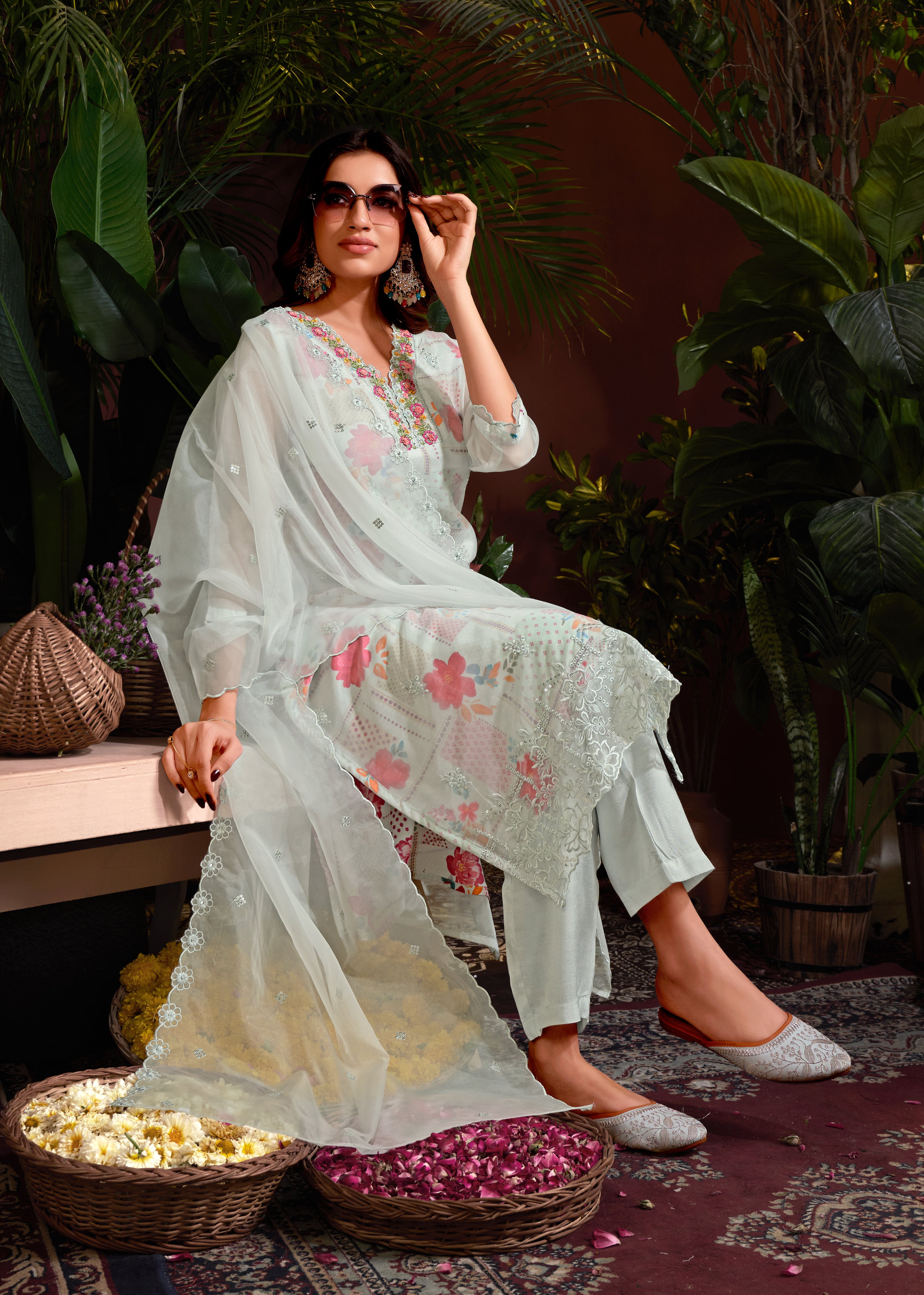 Costume Salwar à imprimé numérique en organza argenté avec pantalon Dupatta