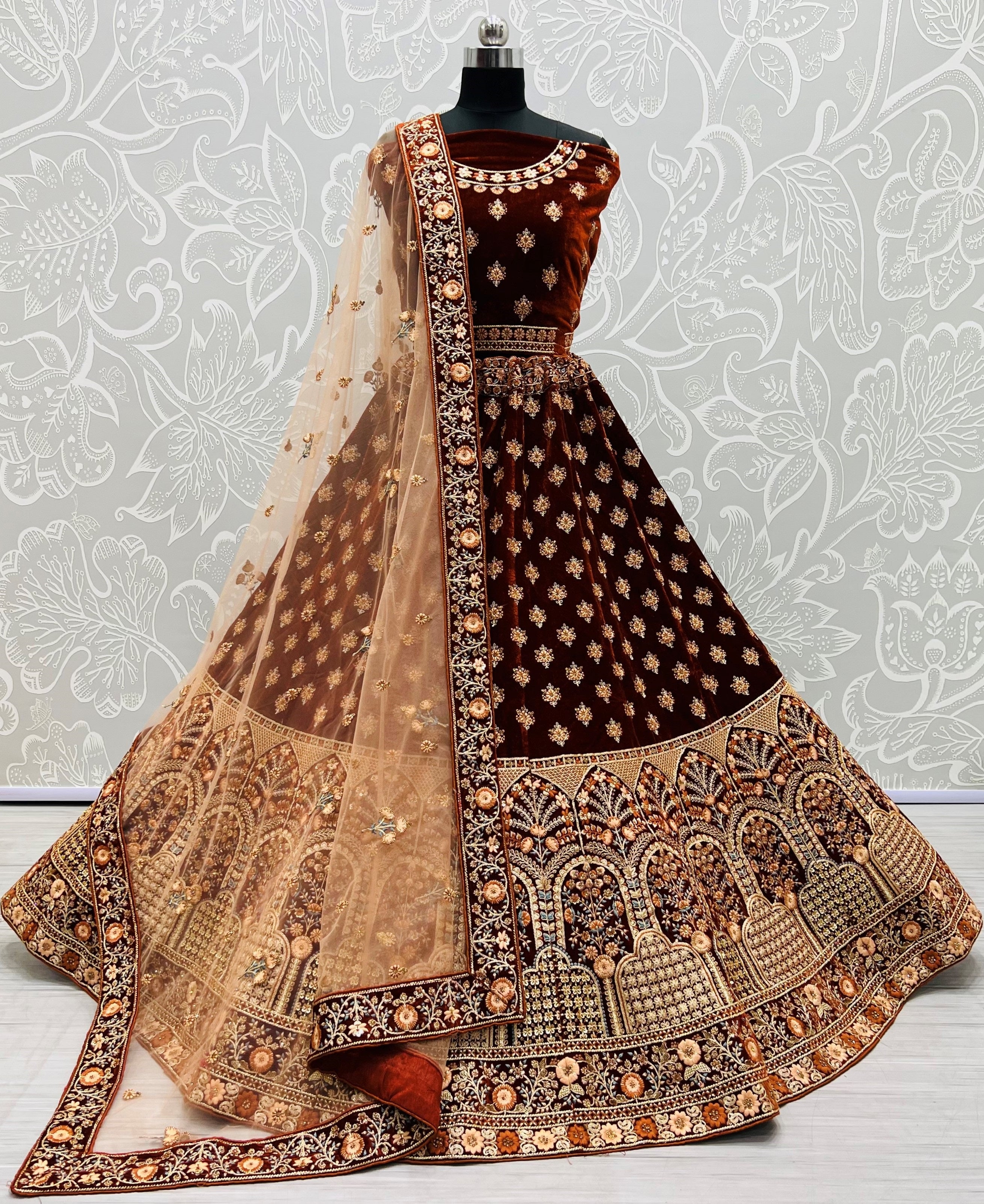 Lehenga Choli de mariée brodé à paillettes en velours café
