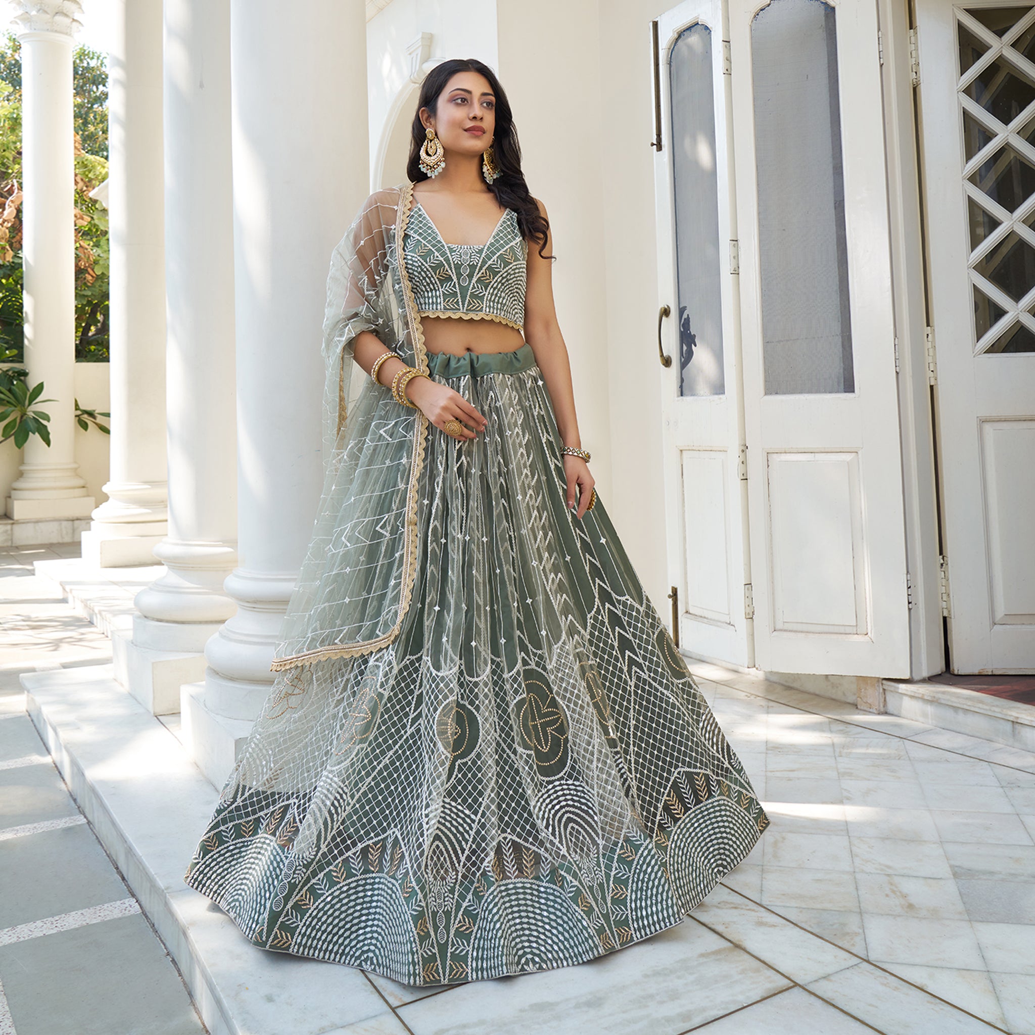 Lehenga Choli brodé en filet de papillon vert poussiéreux