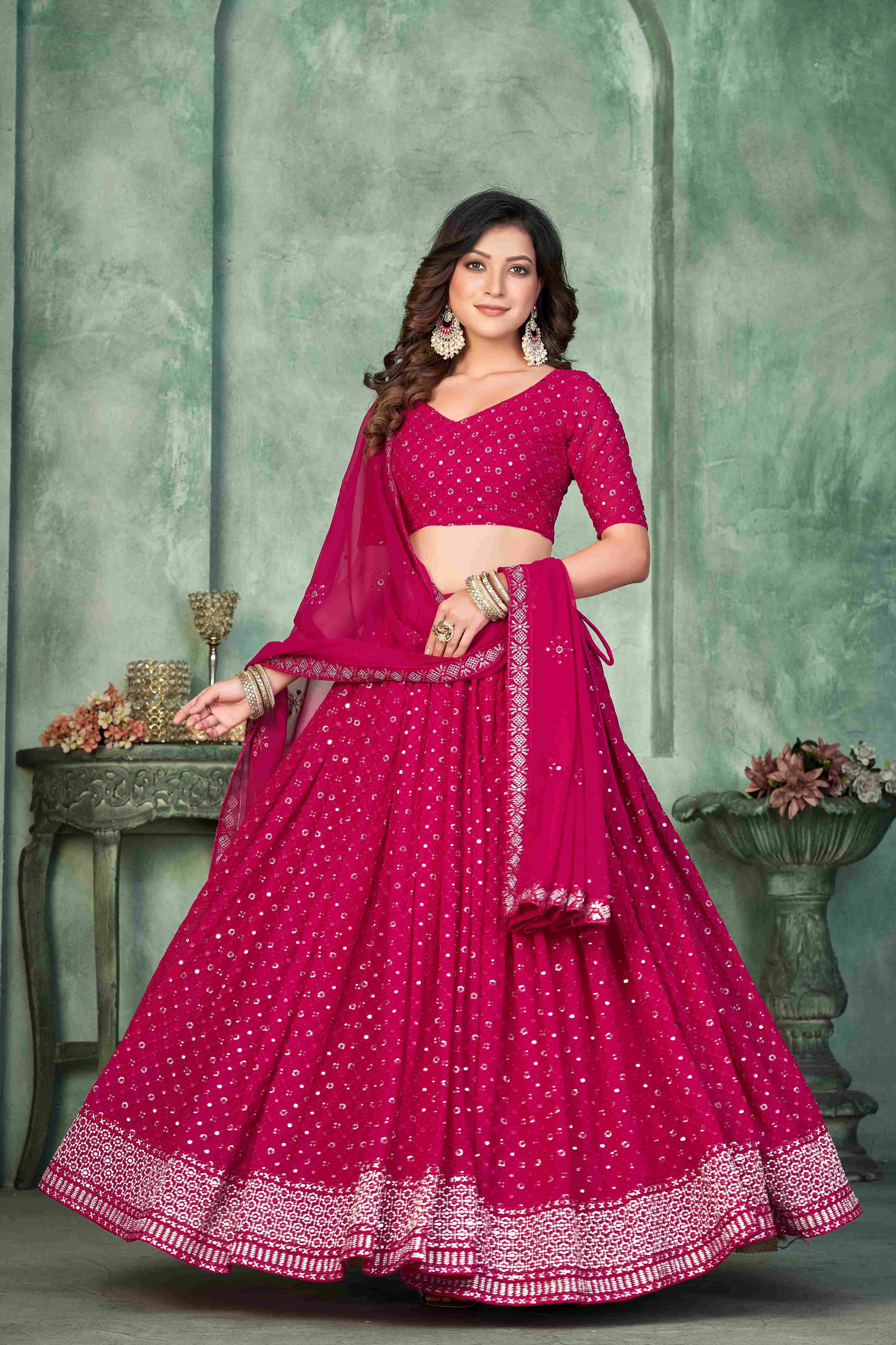 Lehenga Choli brodé en georgette rose vif