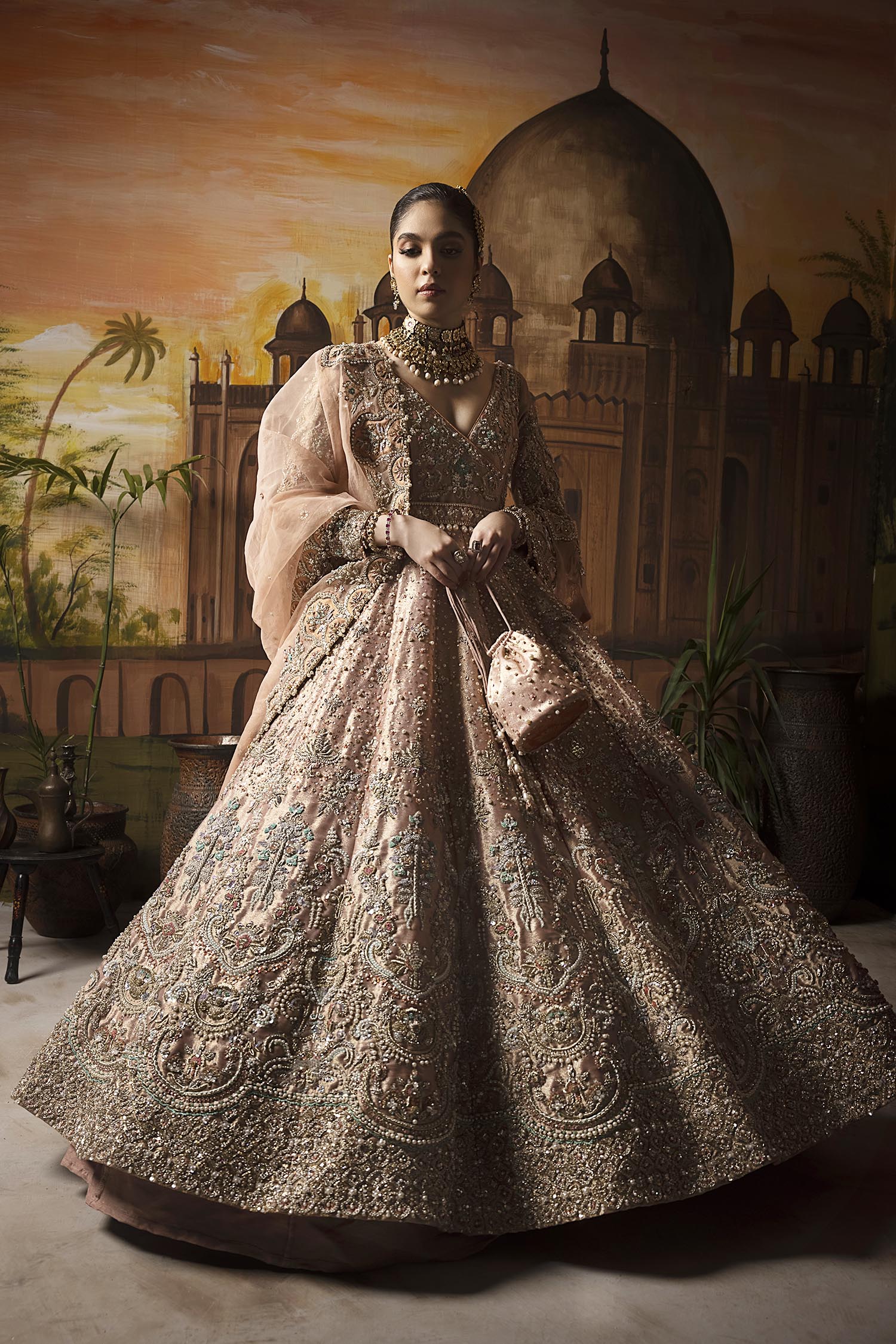 Flottez à travers la saison des mariages dans un bonheur éthéré en « iris ». Une silhouette classique de Pishwas en tissu long au sol est fortement ornée à la main de perles et de cristaux, de broderies indigènes Naqshi et Dabka donnant vie à l'œuvre d'art tentaculaire avec un travail Resham dans des tons d'aqua et de rose perle. Superposé avec un somptueux Dupatta en organza entièrement givré avec des embellissements complexes faits à la main, luxueusement encadré avec des bordures détaillées, ce grand design vous aiderait à faire une déclaration opulente lors de votre grand jour.