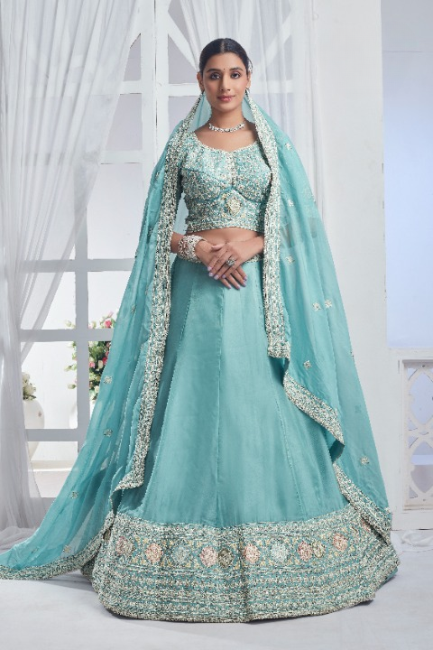 Lehenga Choli brodé à paillettes en organza bleu clair