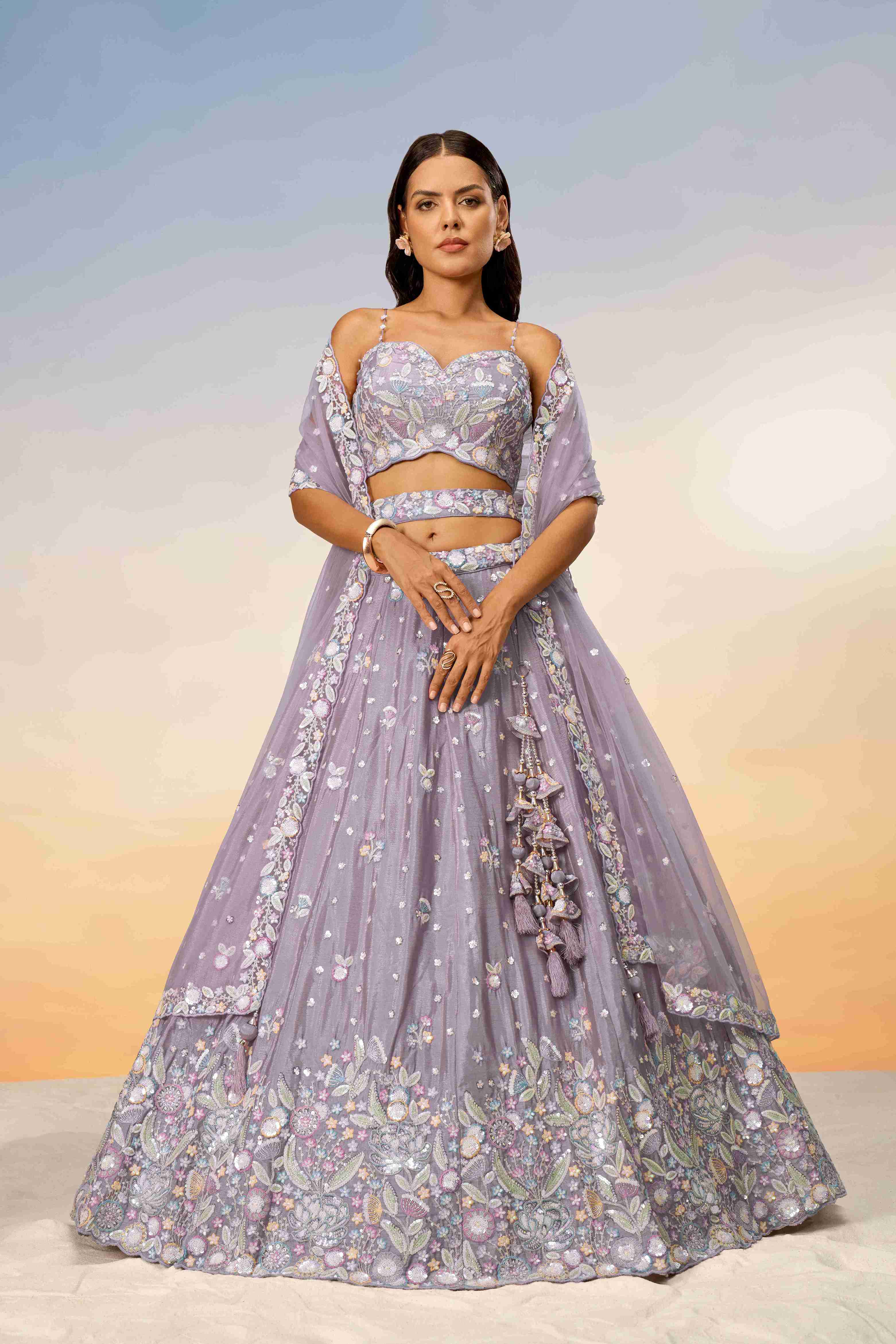 Lehenga Choli brodé en mousseline de soie mauve à paillettes