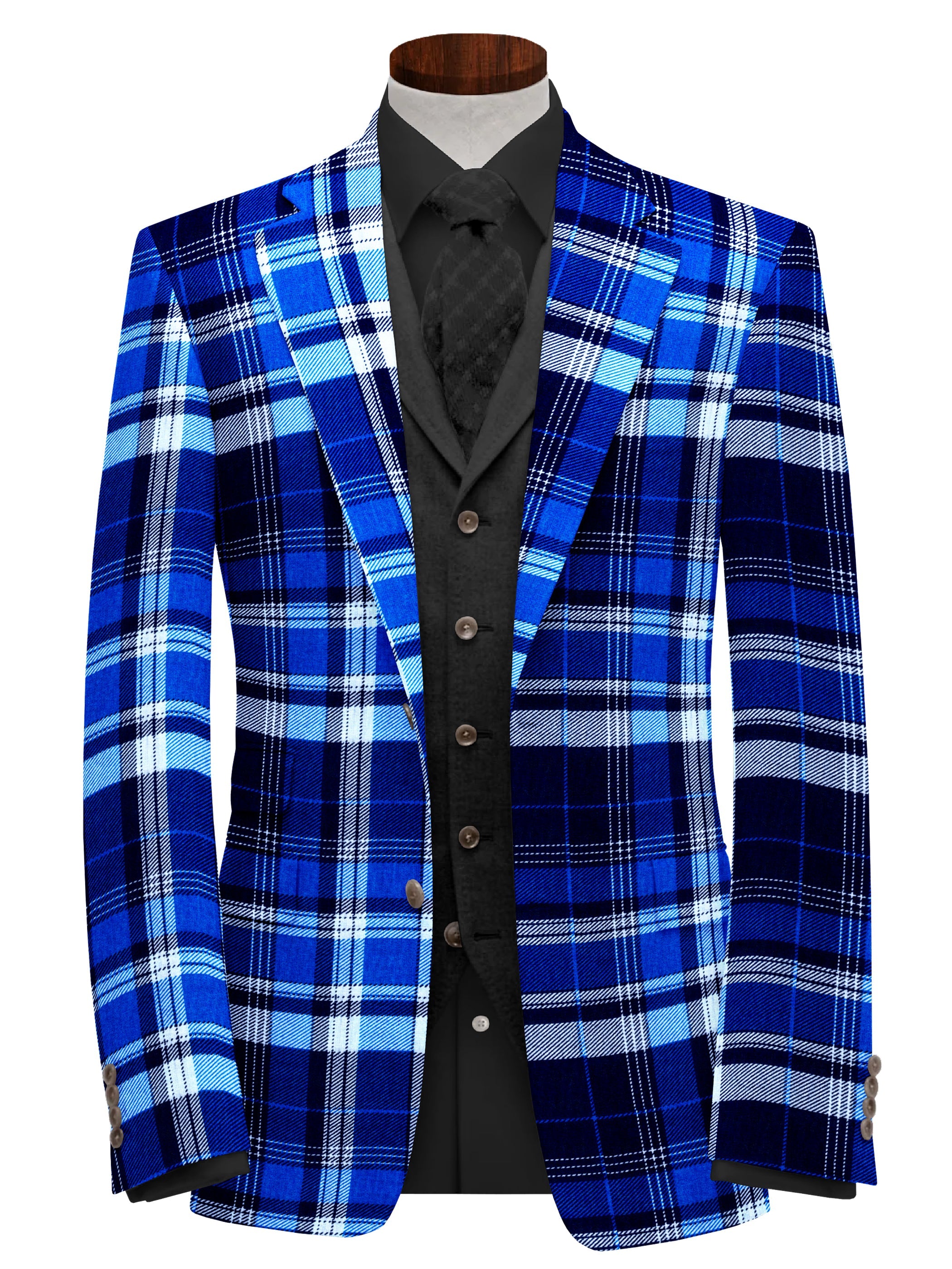 Veste de costume à deux boutons pour homme bleu royal, imprimé à carreaux, revers crantés, coupe slim, blazer élégant