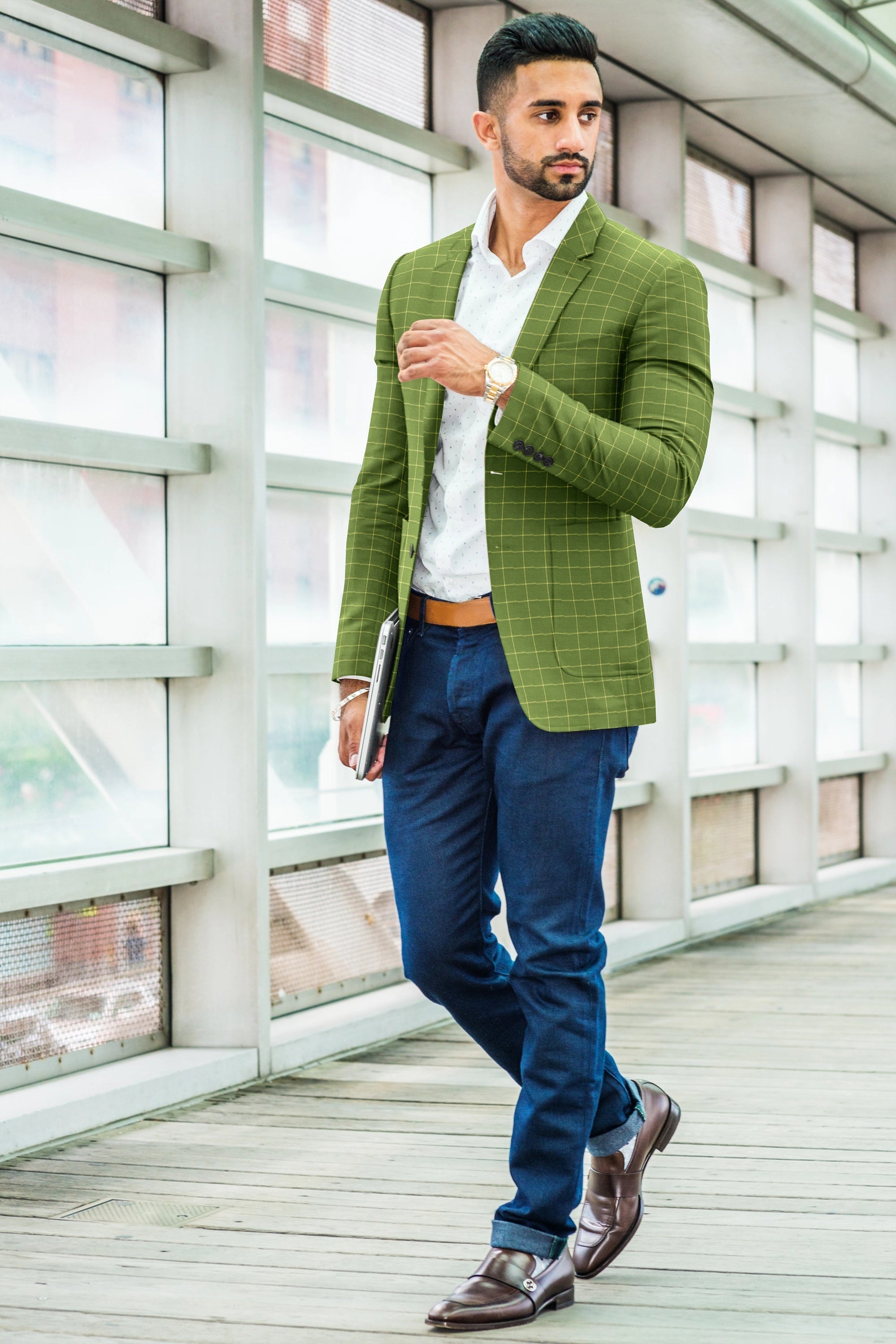 Veste de costume à deux boutons pour homme, verte, à carreaux, à revers crantés, coupe slim, élégante