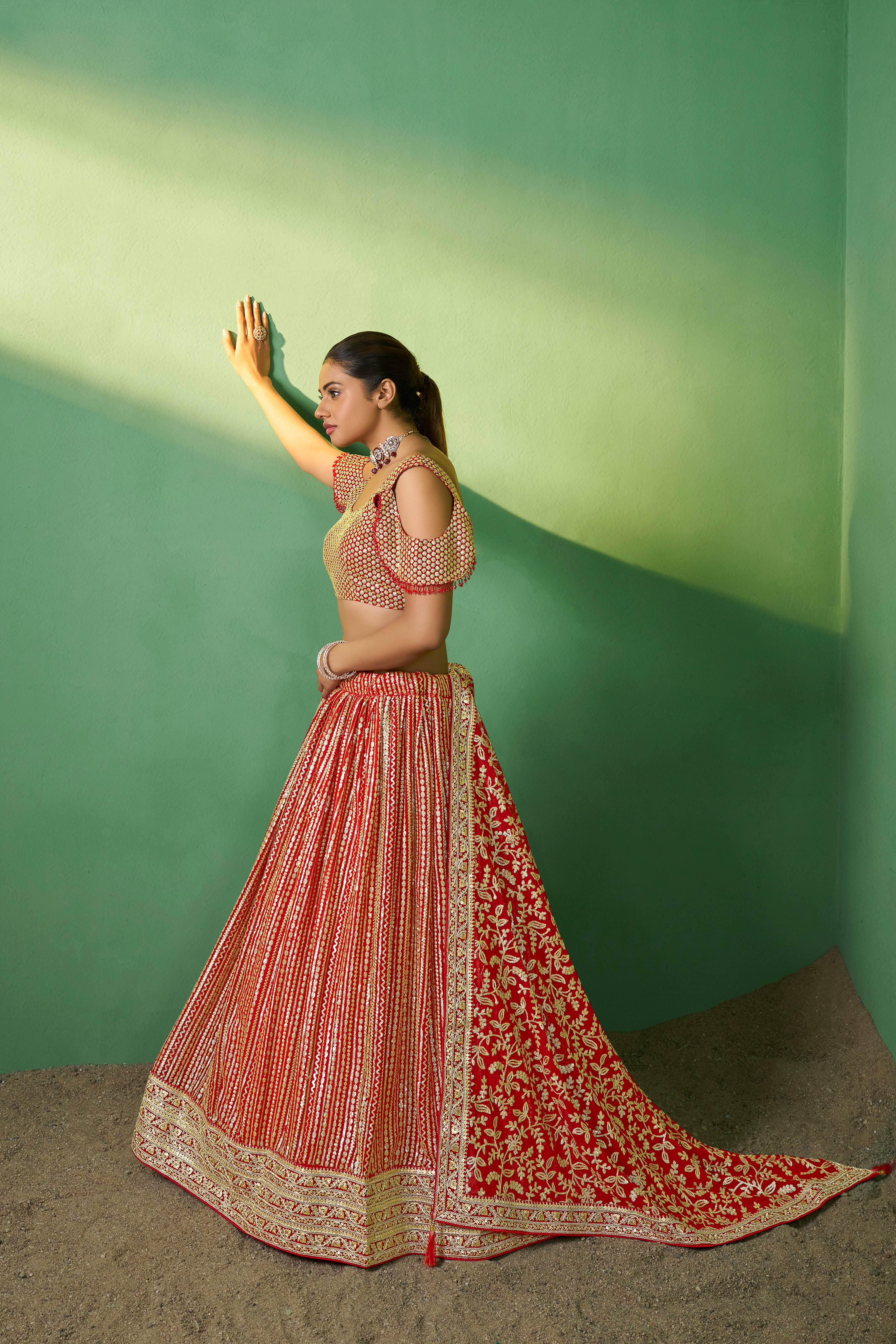 • Le Lehenga Choli est une tenue traditionnelle indienne généralement portée par les femmes pour des occasions spéciales telles que les mariages, les festivals et les événements officiels. La tenue se compose d'une jupe longue (Lehenga), d'un chemisier (Choli) et d'un Dupatta (foulard).
