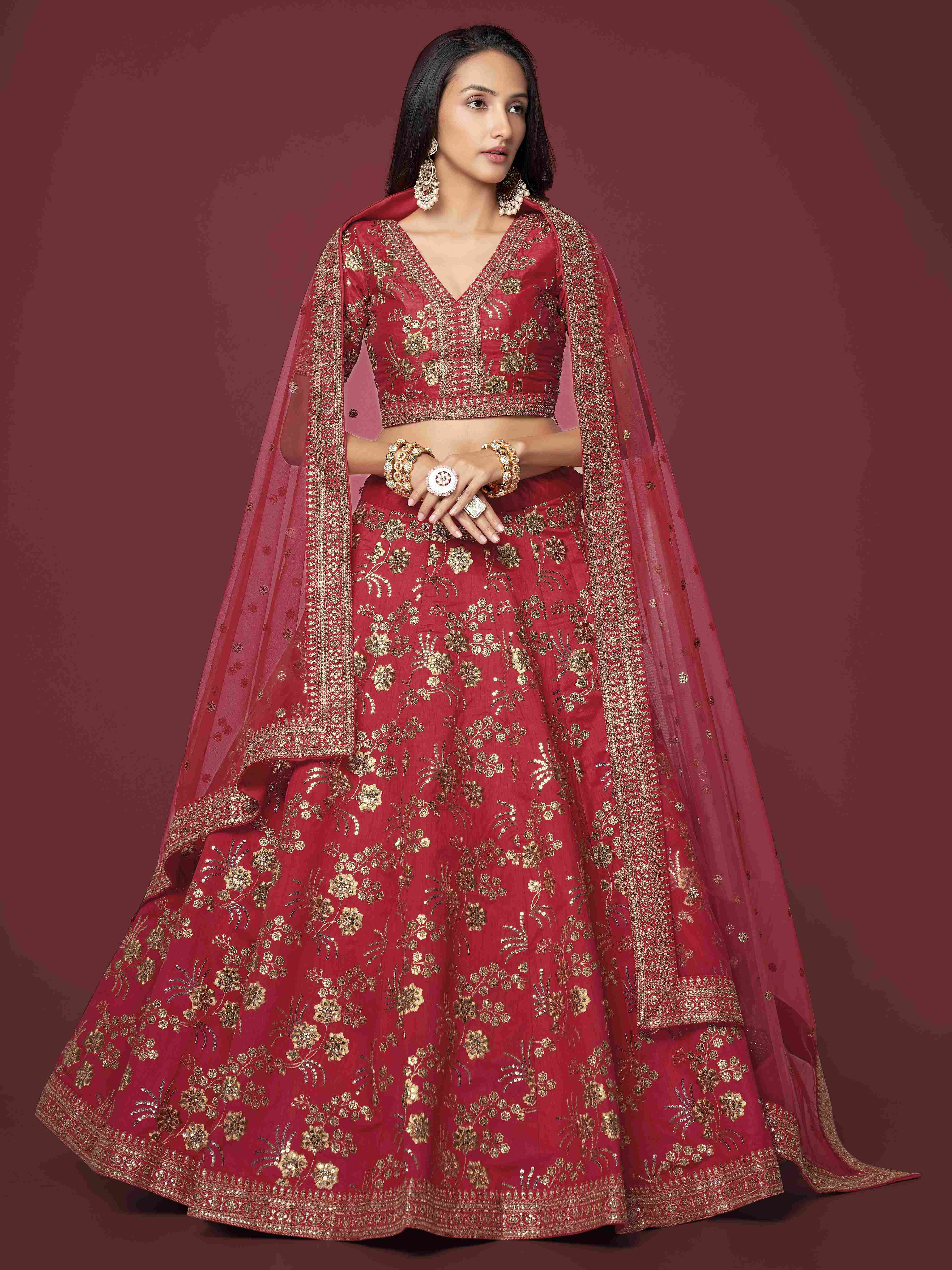 Lehenga Choli en filet brodé à paillettes rouges Dori