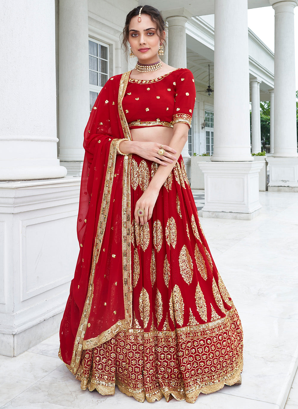 Lehenga Choli en imitation georgette brodée de paillettes rouges
